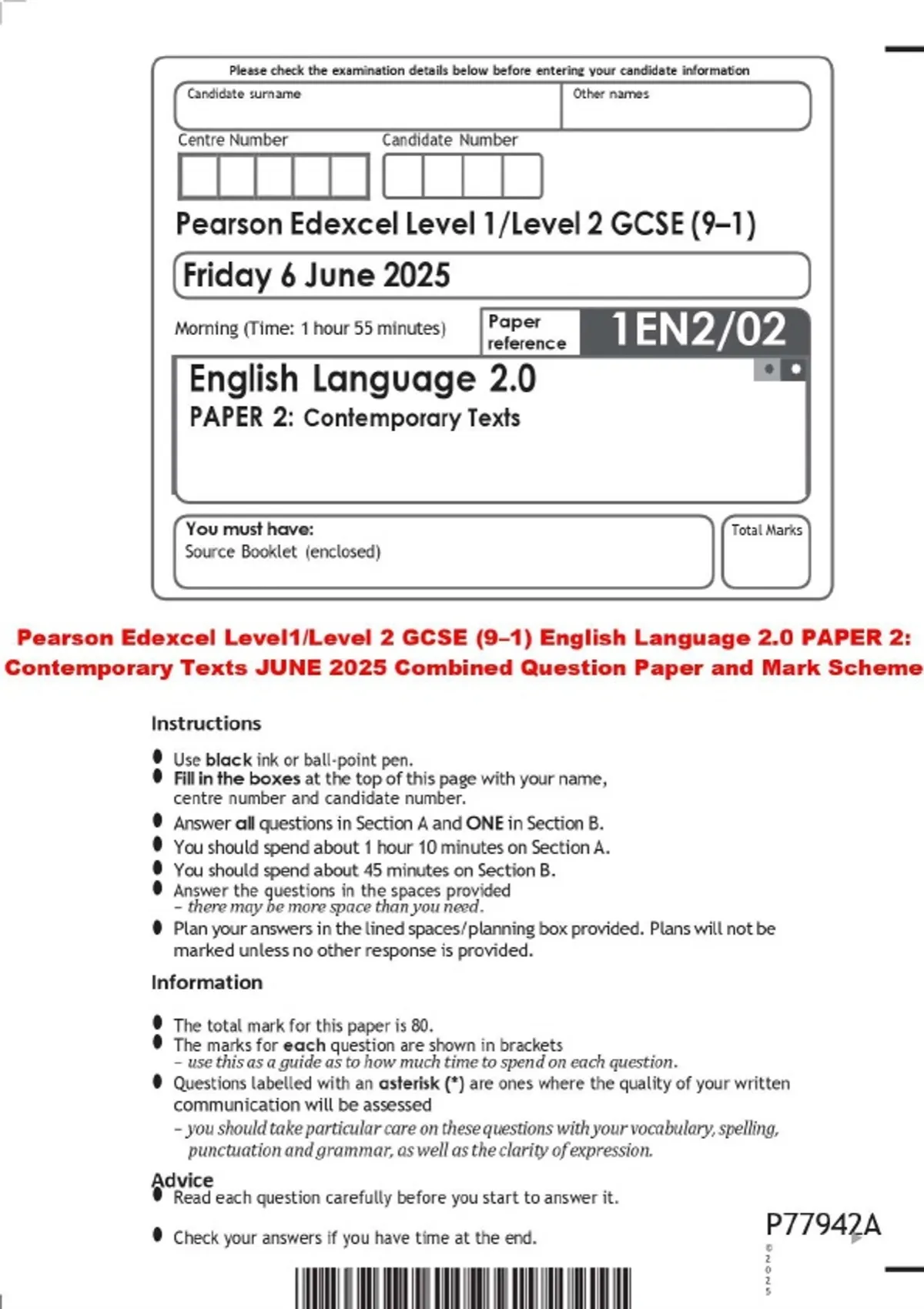 Pearson Edexcel Level1/Level 2 GCSE (9–1) English Language 2.0 PAPER 2: Contemporary Texts JUNE 2025 Combined Question Paper and Mark Scheme