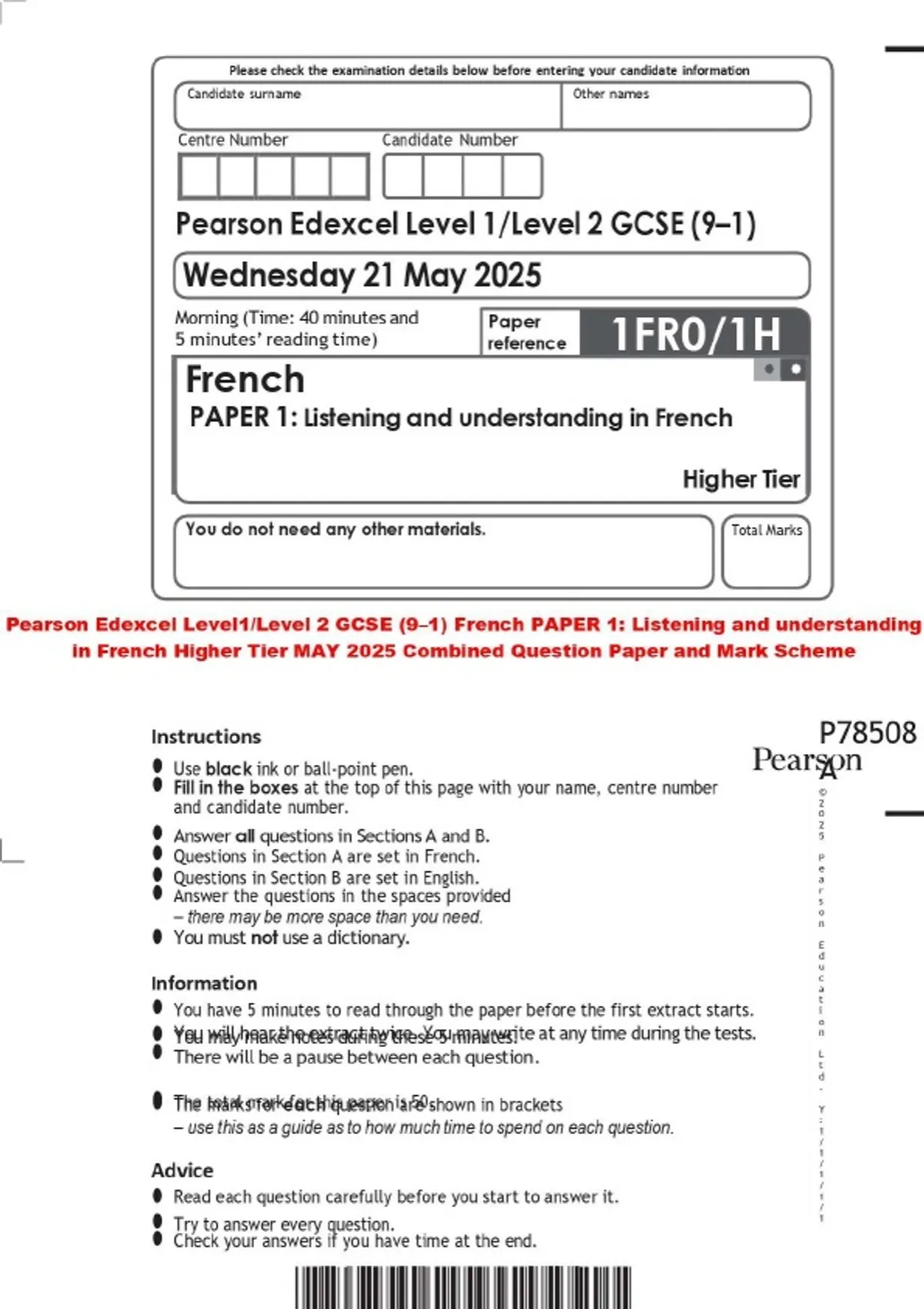 Pearson Edexcel Level1/Level 2 GCSE (9–1) French PAPER 1: Listening and understanding in French Higher Tier MAY 2025 Combined Question Paper and Mark Scheme