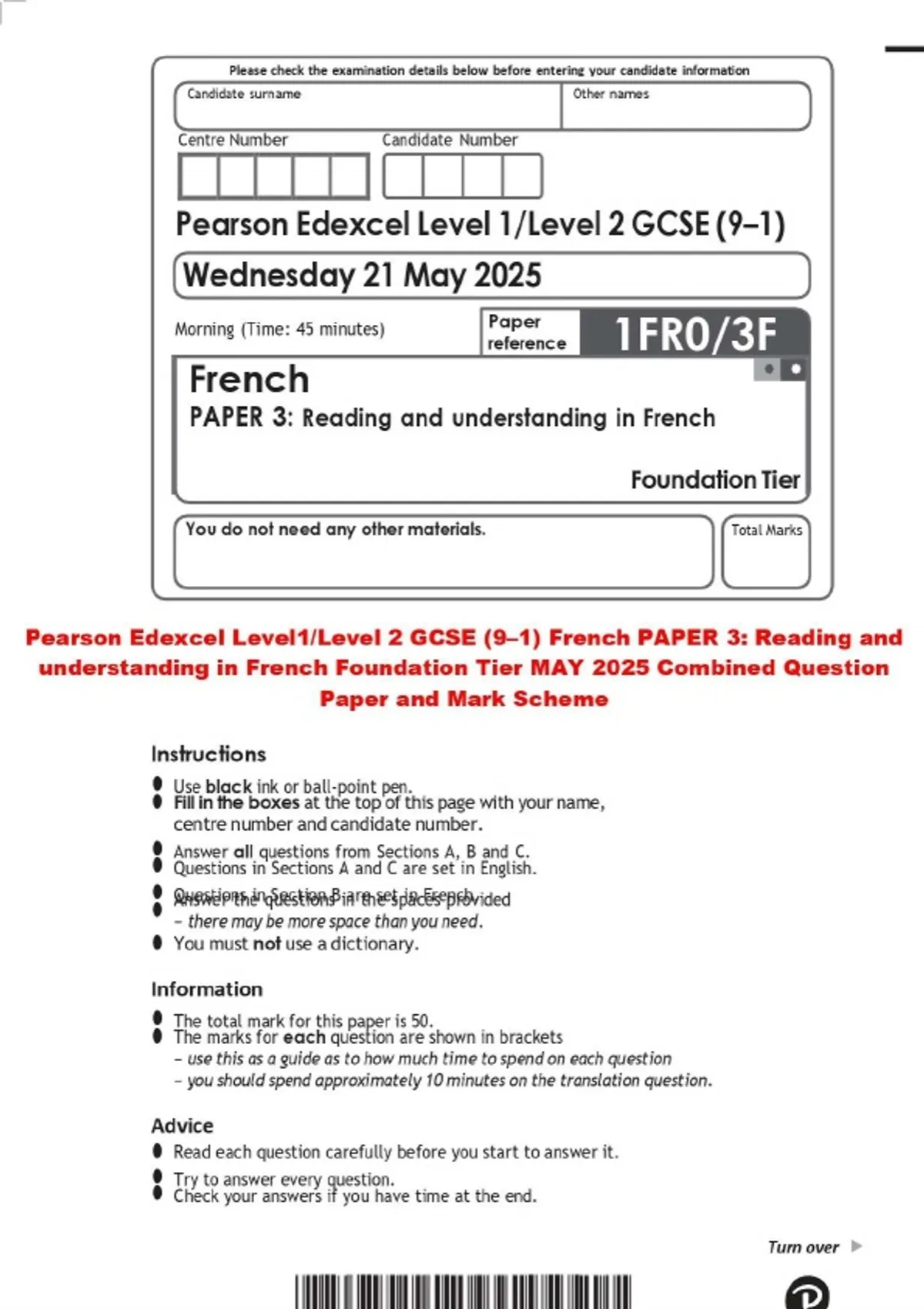 Pearson Edexcel Level1/Level 2 GCSE (9–1) French PAPER 3: Reading and understanding in French Foundation Tier MAY 2025 Combined Question Paper and Mark Scheme