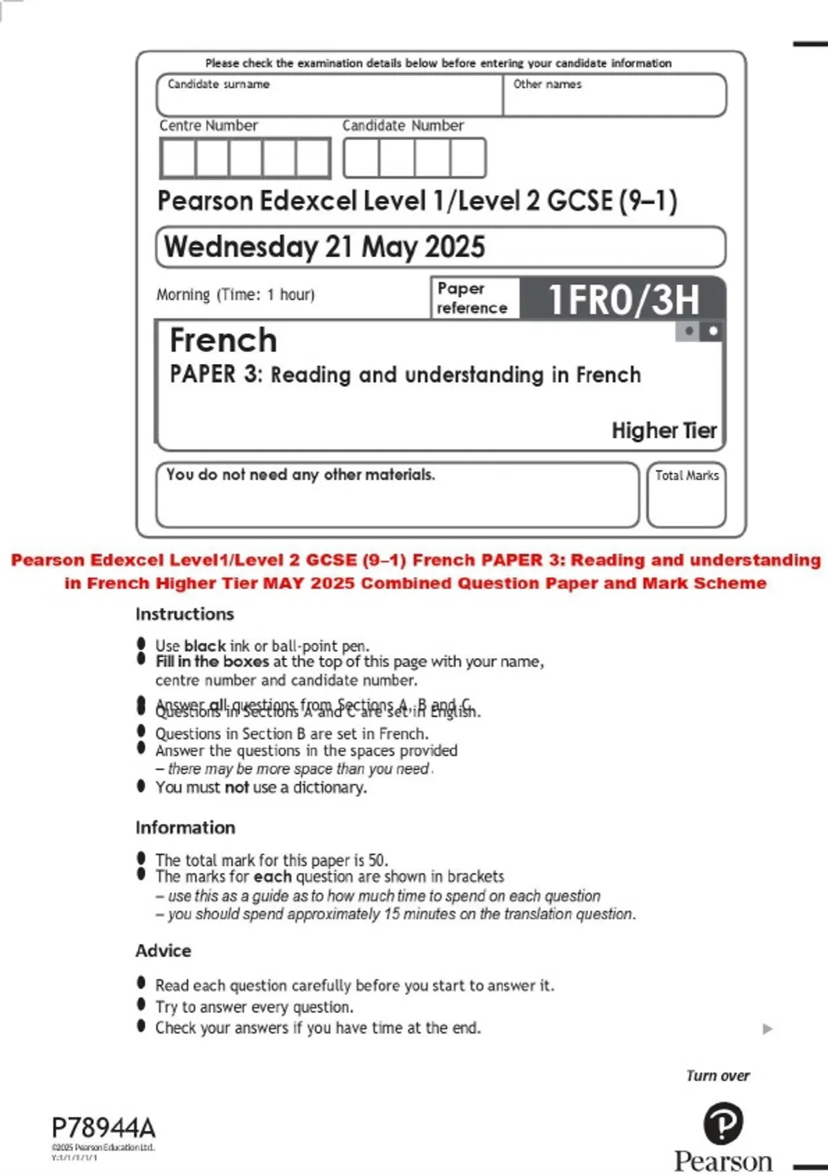 Pearson Edexcel Level1/Level 2 GCSE (9–1) French PAPER 3: Reading and understanding in French Higher Tier MAY 2025 Combined Question Paper and Mark Scheme