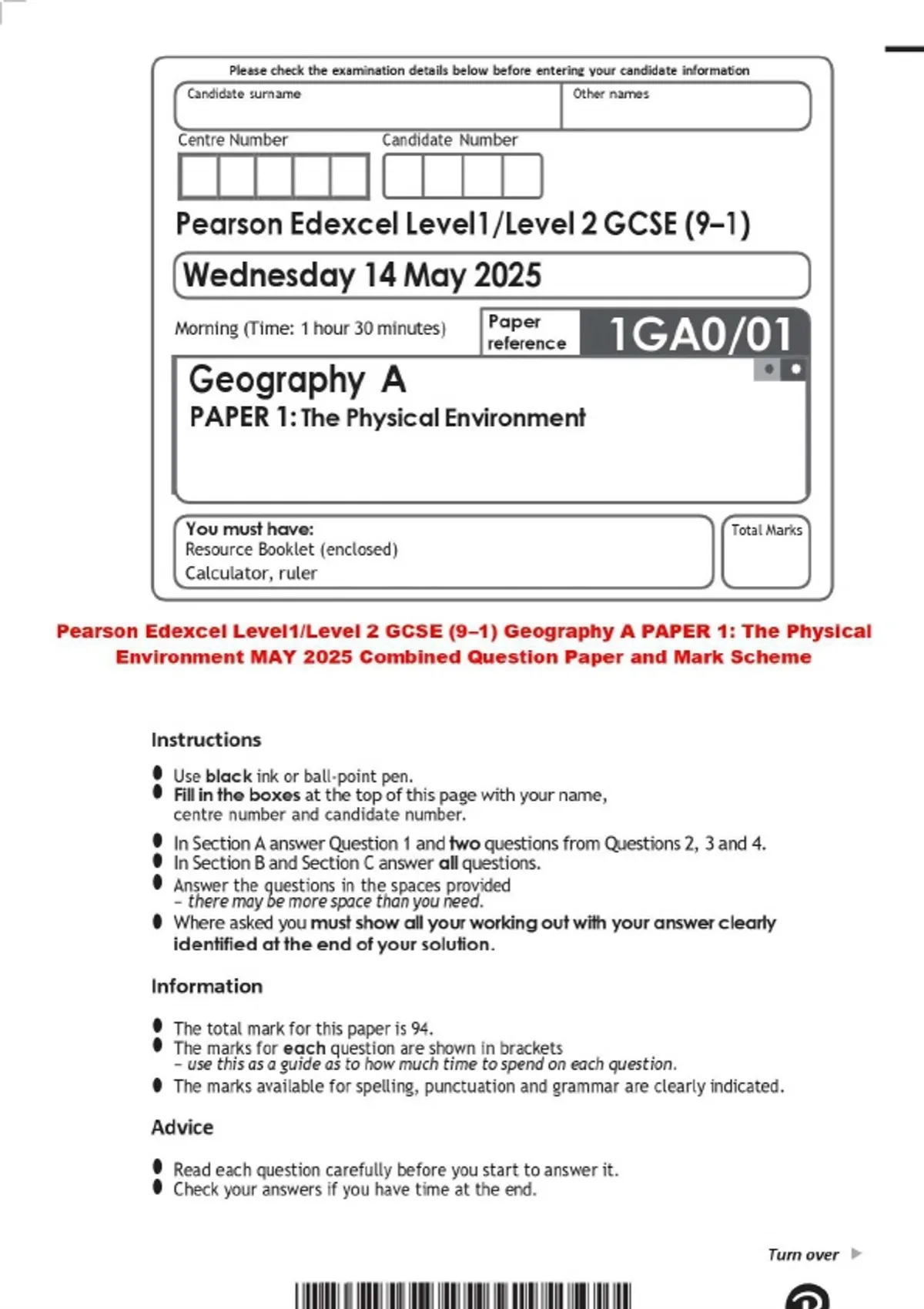 Pearson Edexcel Level1/Level 2 GCSE (9–1) Geography A PAPER 1: The Physical Environment MAY 2025 Combined Question Paper and Mark Scheme