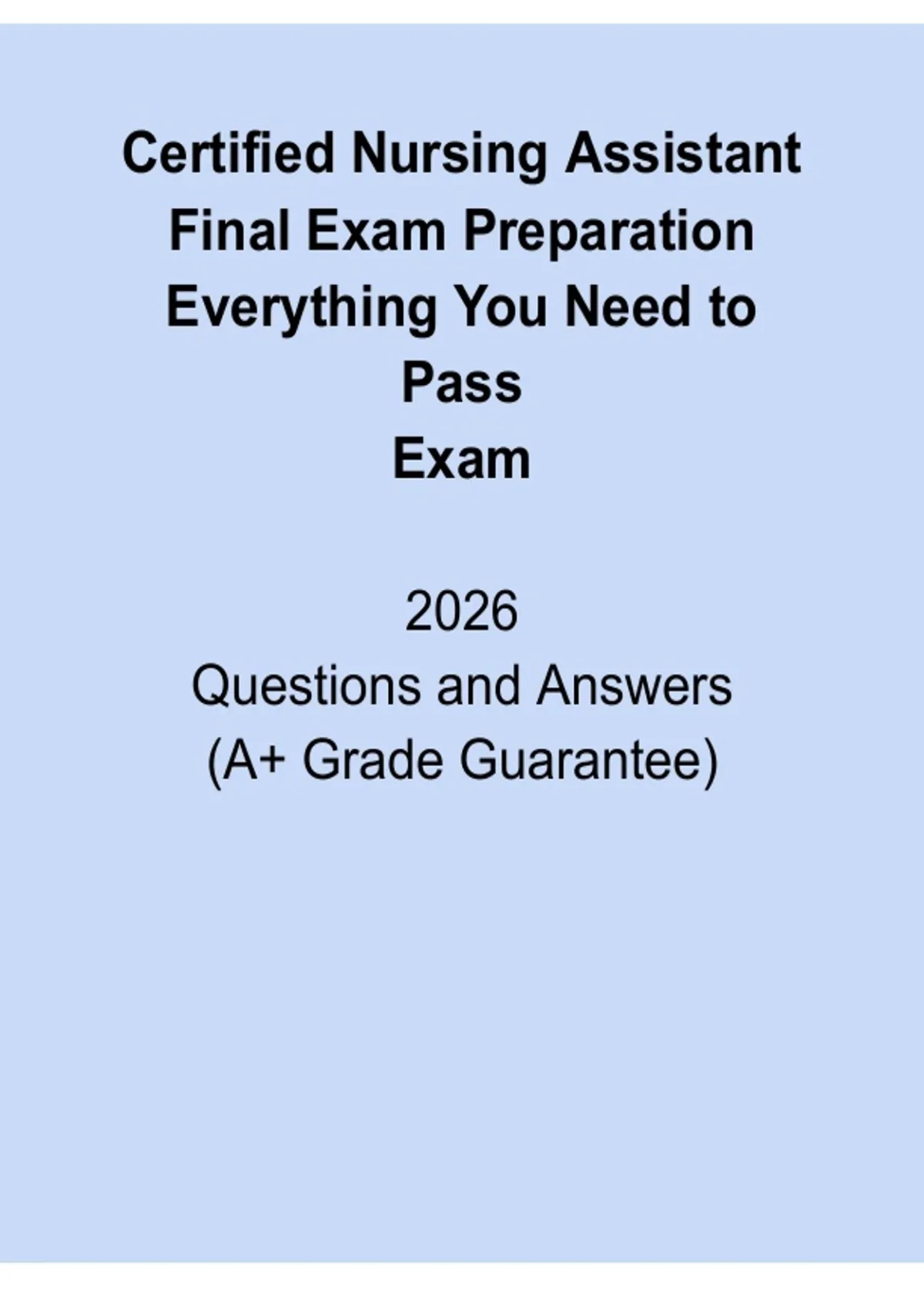 Get fully prepared for the Certified Nursing Assistant (CNA) 2026 Final Exam with this all-in-one exam preparation PDF covering everything you need to pass with confidence. This resource provides focused review of essential CNA skills, patient care principles, safety guidelines, and exam-relevant concepts to support efficient and effective studying. Ideal for CNA students approaching their final exam, this guide helps reinforce knowledge, reduce exam anxiety, and maximize your chances of success on exam day.