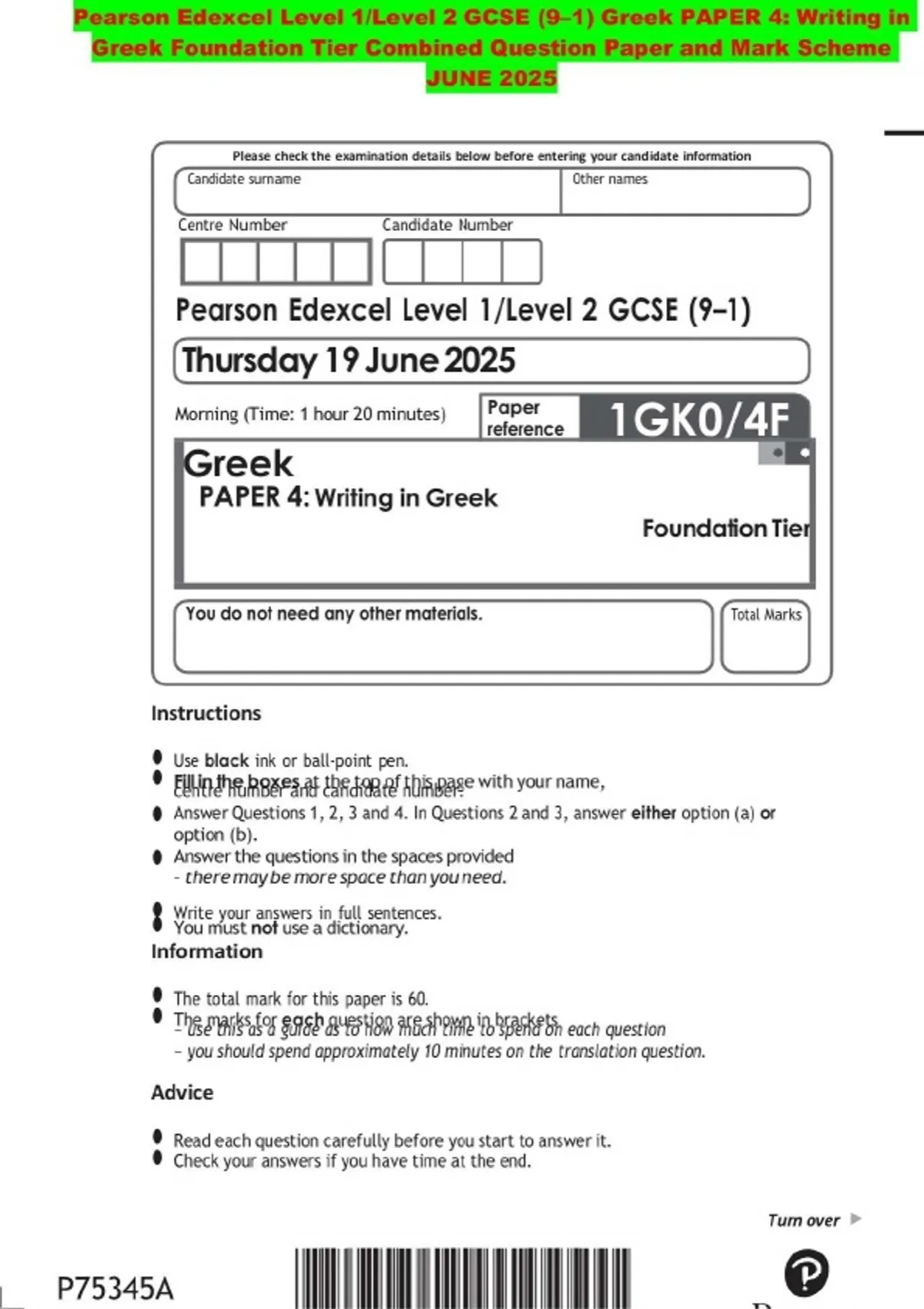 Pearson Edexcel Level 1/Level 2 GCSE (9–1) Greek PAPER 4: Writing in Greek Foundation Tier Combined Question Paper and Mark Scheme JUNE 2025