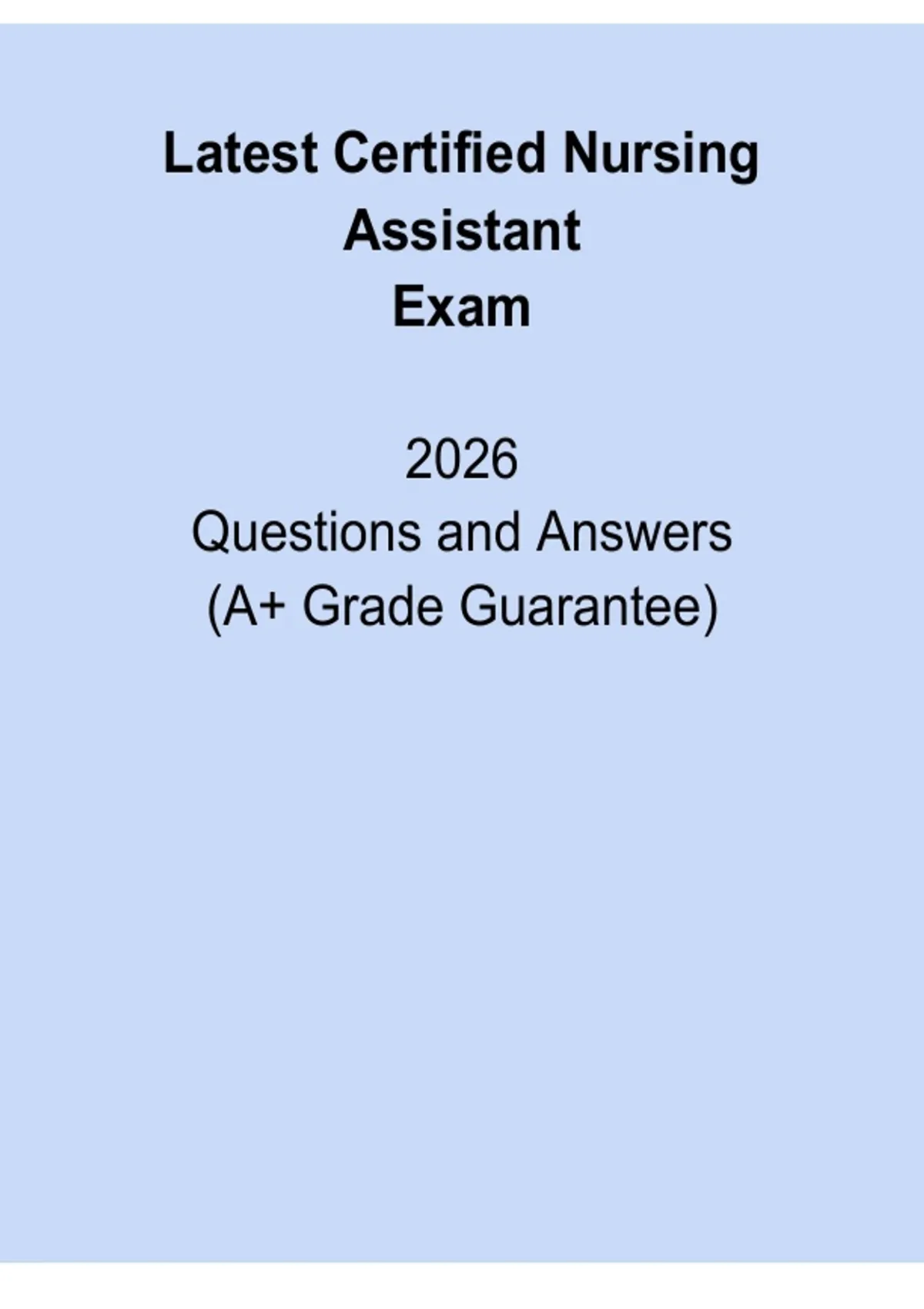 Stay fully prepared for the Certified Nursing Assistant (CNA) Exam 2026 with this updated questions and answers PDF designed to reflect current exam standards. This resource helps nursing assistant candidates practice with realistic exam-style questions, reinforce essential CNA knowledge, and build confidence through clear, correct answers. Ideal for first-time test takers and those seeking extra review, this guide supports effective preparation and improves exam readiness.