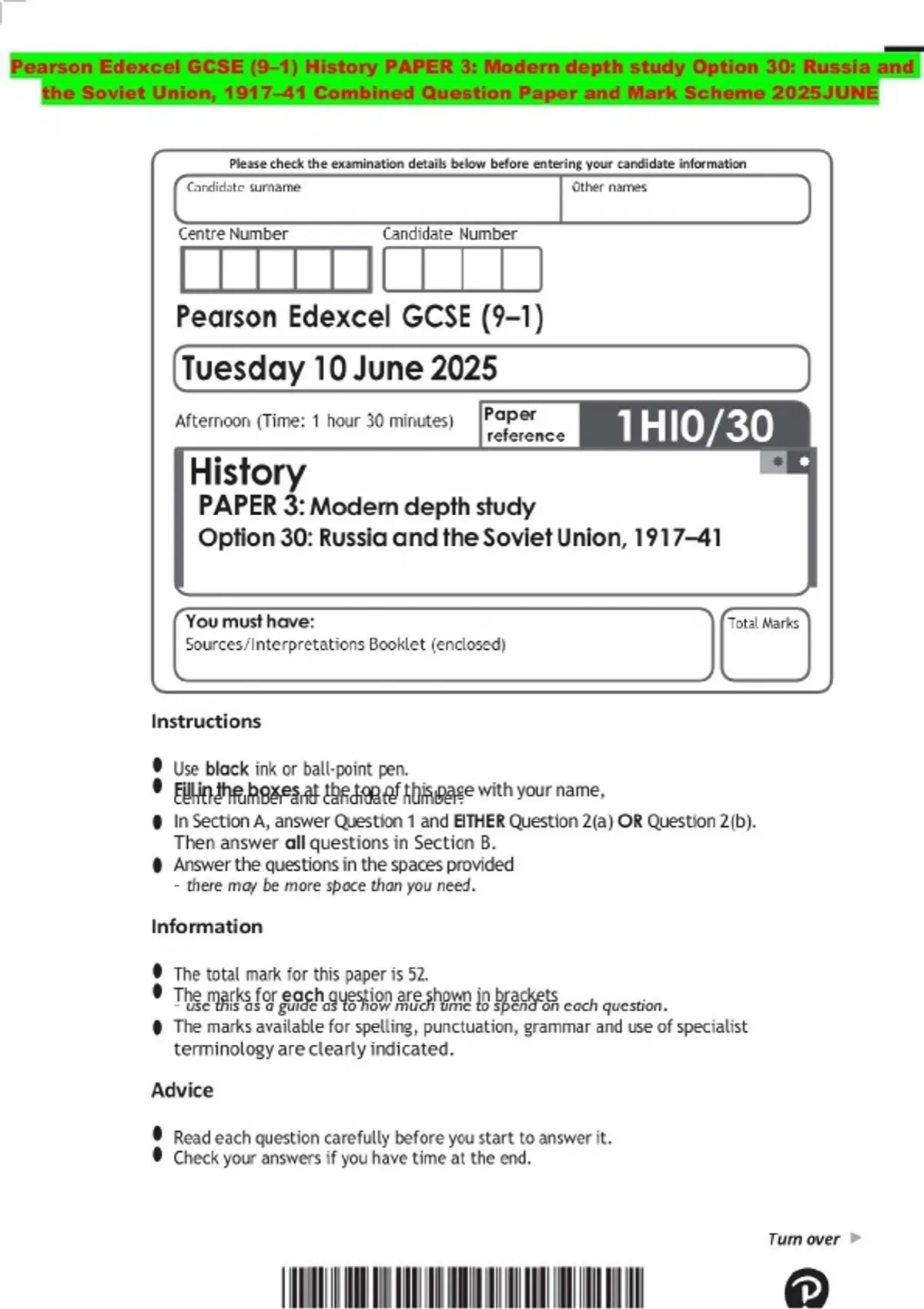 Pearson Edexcel GCSE (9–1) History PAPER 3: Modern depth study Option 30: Russia and the Soviet Union, 1917–41 Combined Question Paper and Mark Scheme 2025JUNE