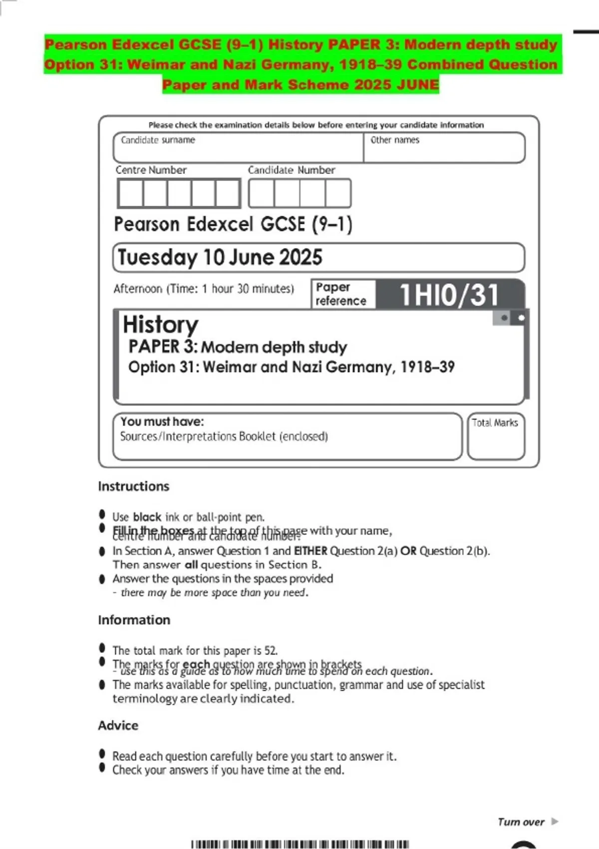 Pearson Edexcel GCSE (9–1) History PAPER 3: Modern depth study Option 31: Weimar and Nazi Germany, 1918–39 Combined Question Paper and Mark Scheme 2025 JUNE