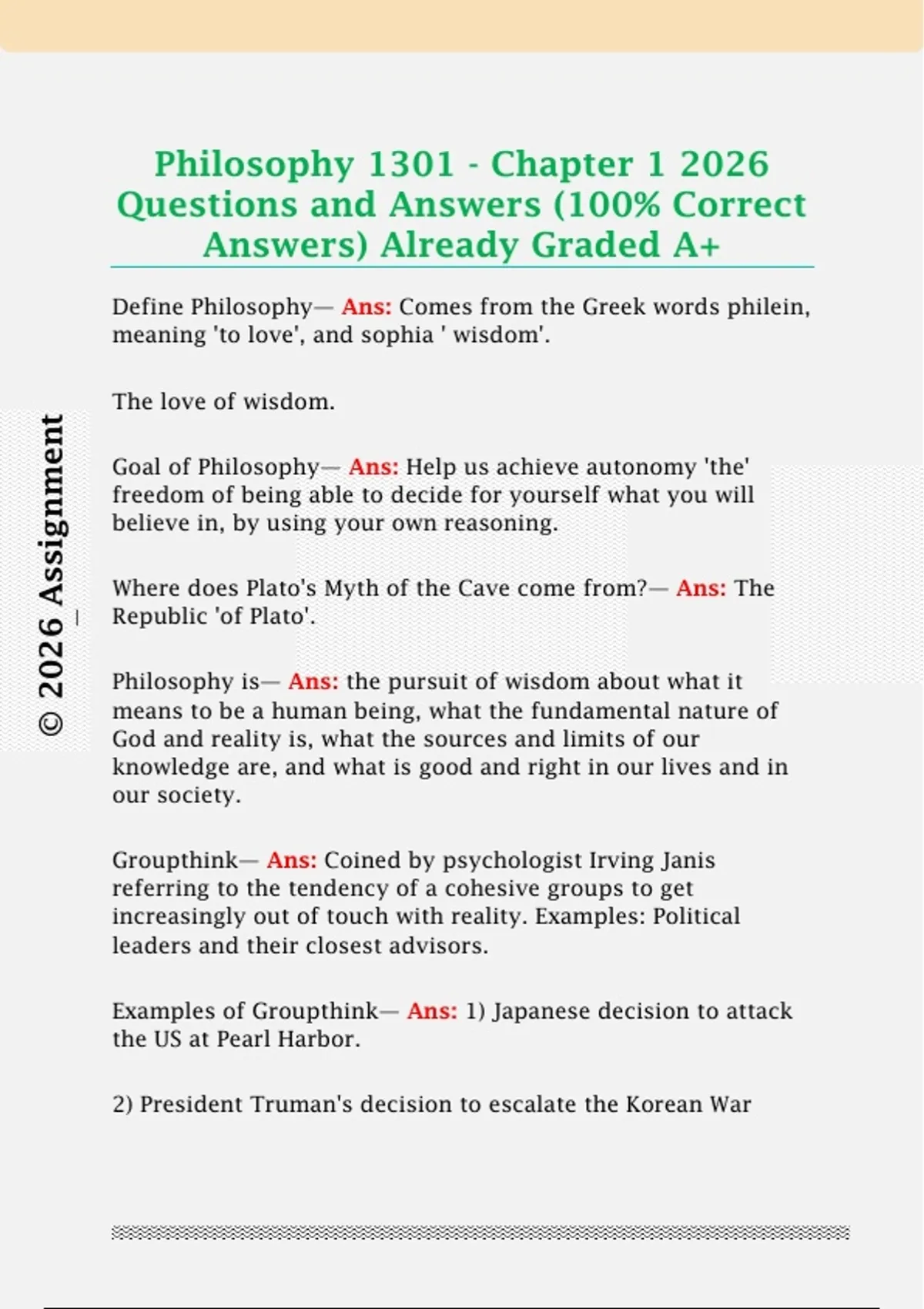 Philosophy 1301 - Chapter 1 2026 Questions and Answers (100% Correct Answers) Already Graded A+ Philosophy 1301 - Chapter 1 2026 Questions and Answers (100% Correct Answers) Already Graded A+