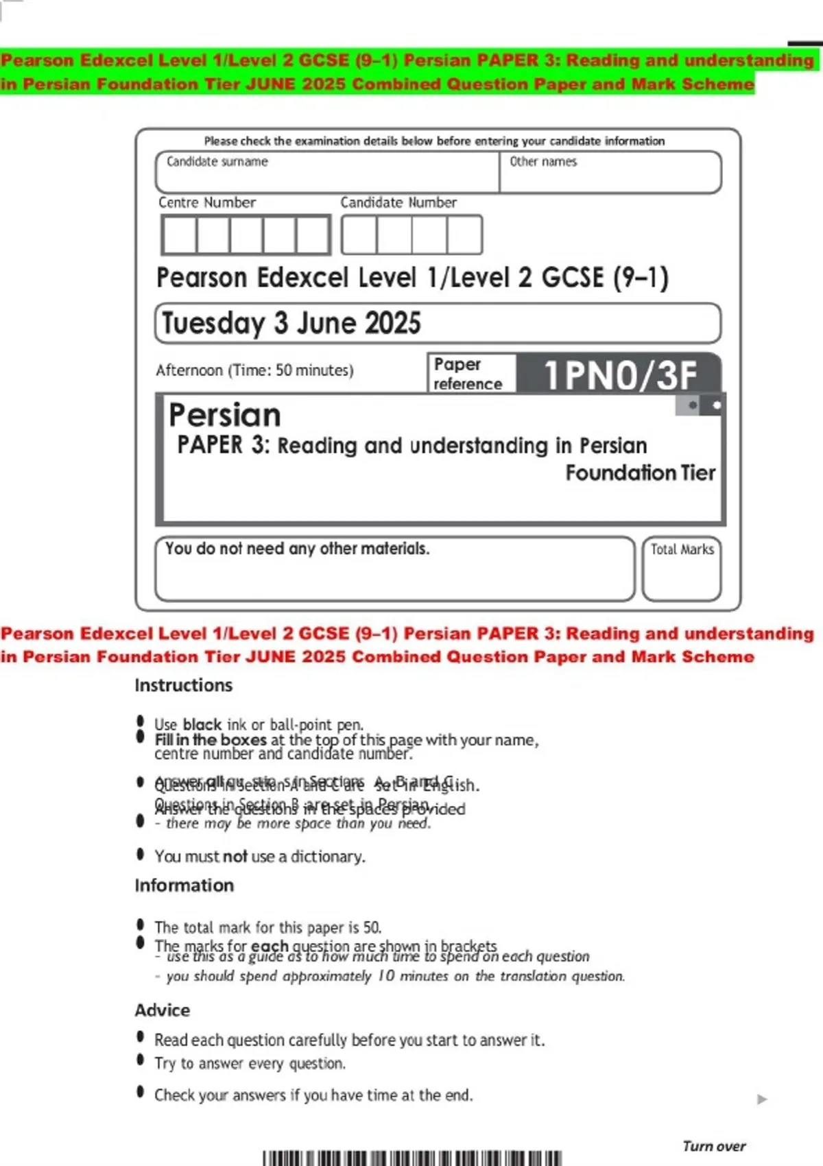 Pearson Edexcel Level 1/Level 2 GCSE (9–1) Persian PAPER 3: Reading and understanding in Persian Foundation Tier JUNE 2025 Combined Question Paper and Mark Scheme