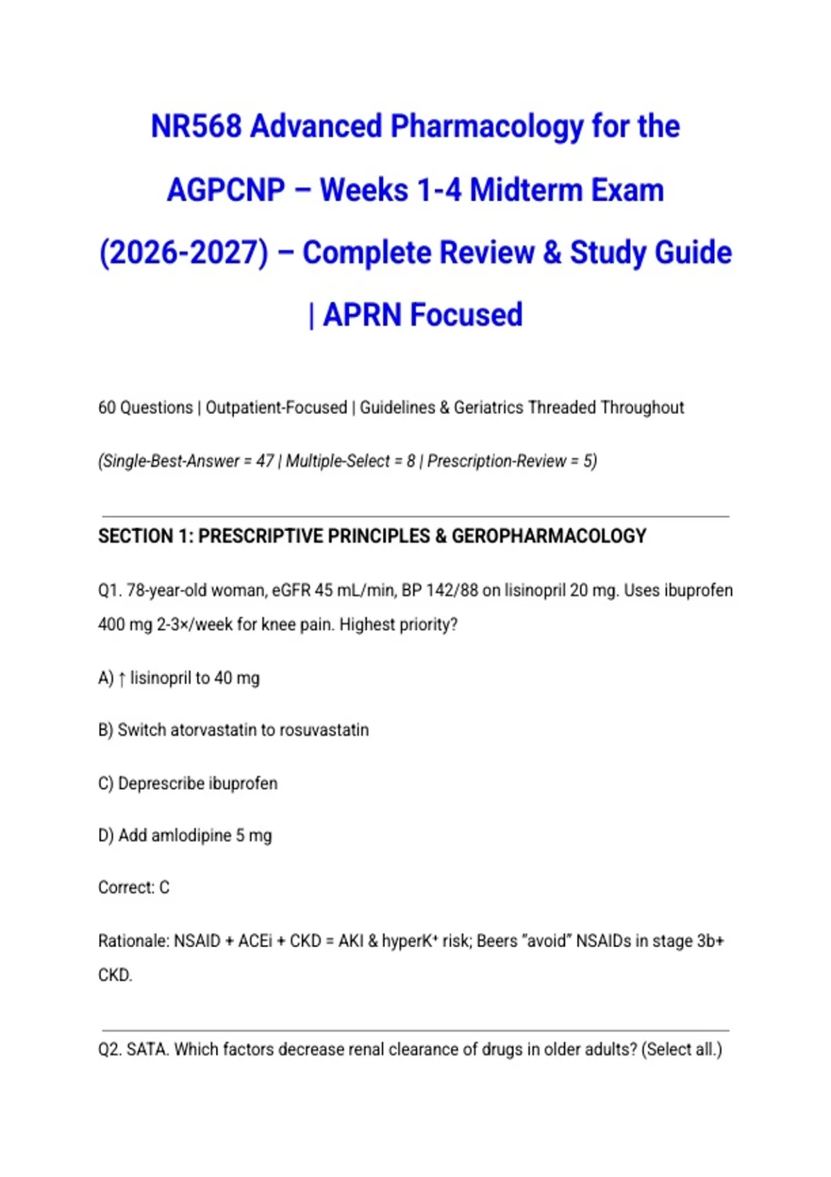 NR568 Advanced Pharmacology for the AGPCNP – Weeks 1-4 Midterm Exam () – Complete Review & Study Guide | APRN Focused