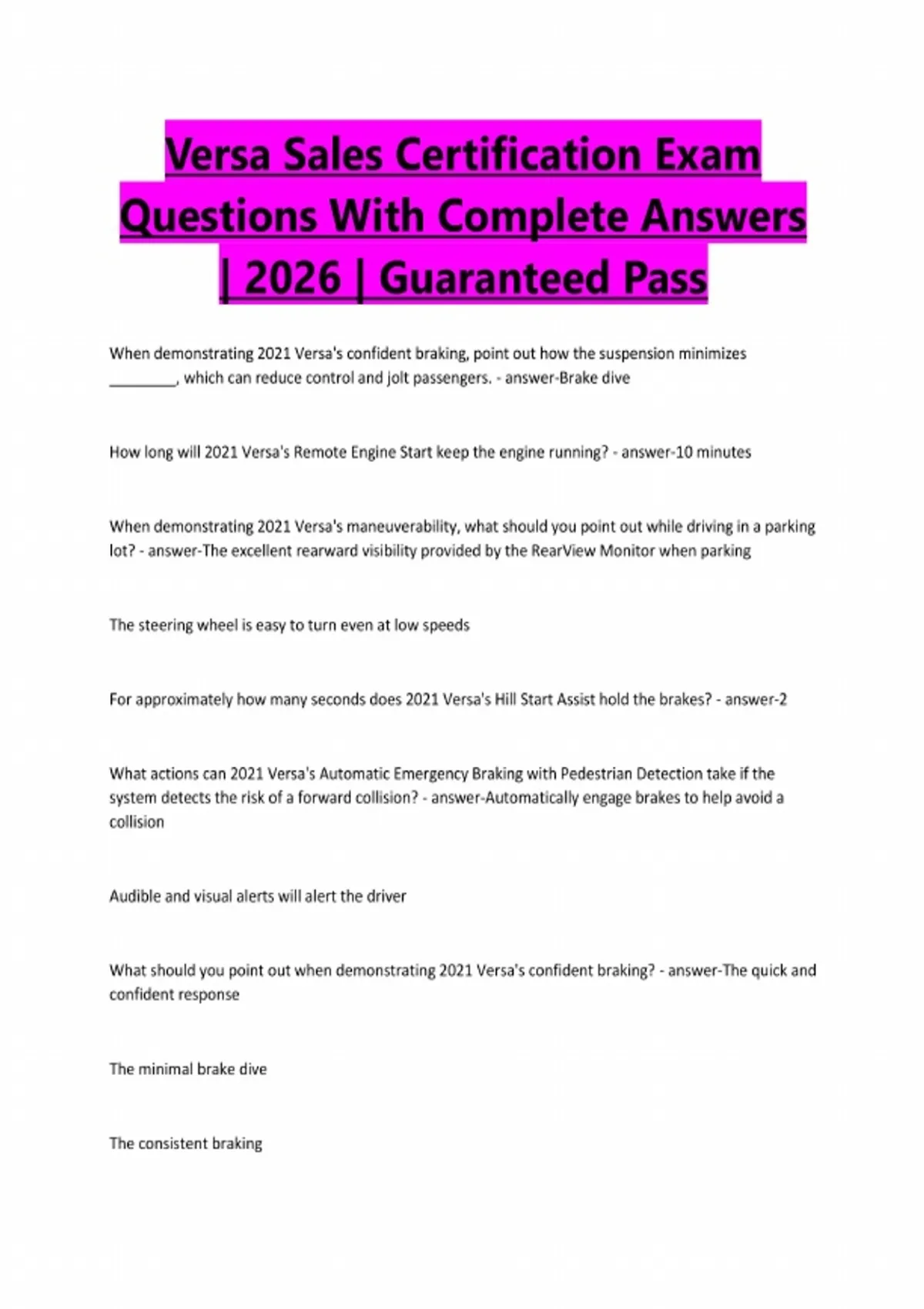 Versa Sales Certification Exam Questions With Complete Answers | 2026 | Guaranteed Pass When demonstrating 2021 Versa's confident braking, point out how the suspension minimizes ________, which can reduce control and jolt passengers. - answer-Brake dive How long will 2021 Versa's Remote Engine Start keep the engine running? - answer-10 minutes When demonstrating 2021 Versa's maneuverability, what should you point out while driving in a parking lot? - answer-The excellent rearward visibility provided by the RearView Monitor when parking The steering wheel is easy to turn even at low speeds For approximately how many seconds does 2021 Versa's Hill Start Assist hold the brakes? - answer-2 What actions can 2021 Versa's Automatic Emergency Braking with Pedestrian Detection take if the system detects the risk of a forward collision? - answer-Automatically engage brakes to help avoid a collision Audible and visual alerts will alert the driver What should you point out when demonstrating 2021 Versa's confident braking? - answer-The quick and confident response The minimal brake dive The consistent brakingRear Automatic Braking on 2021 Versa uses rear-facing sonar sensors to detect ______? - answer-Large stationary objects When demonstrating 2021 Versa's maneuverability, what available systems should you point out when backing up? - answer-Rear Cross Traffic Alert (RCTA) RearView Monitor Rear Automatic Braking (RAB) What are the benefits of 2021 Versa's Continuously Variable Valve Timing Control System (CVTCS)? - answer-Smooth operation at low speeds Improved power throughout the rpm range For 2021, Versa's engine delivers ________ horsepower. - answer-122 How many air bags come standard on 2021 Versa? - answer-10 When a driver receives a text while driving, what can 2021 Versa's Hands-free Text Messaging Assistant do? - answer-Translate text to voice message How does 2021 Versa's Electric Power-assisted steering enhance fuel efficiency? - answer-It doesn't rely on engine power