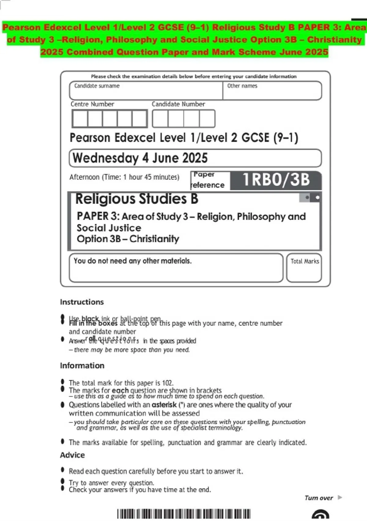 Pearson Edexcel Level 1/Level 2 GCSE (9–1) Religious Study B PAPER 3: Area of Study 3 –Religion, Philosophy and Social Justice Option 3B – Christianity 2025 Combined Question Paper and Mark Scheme June 2025