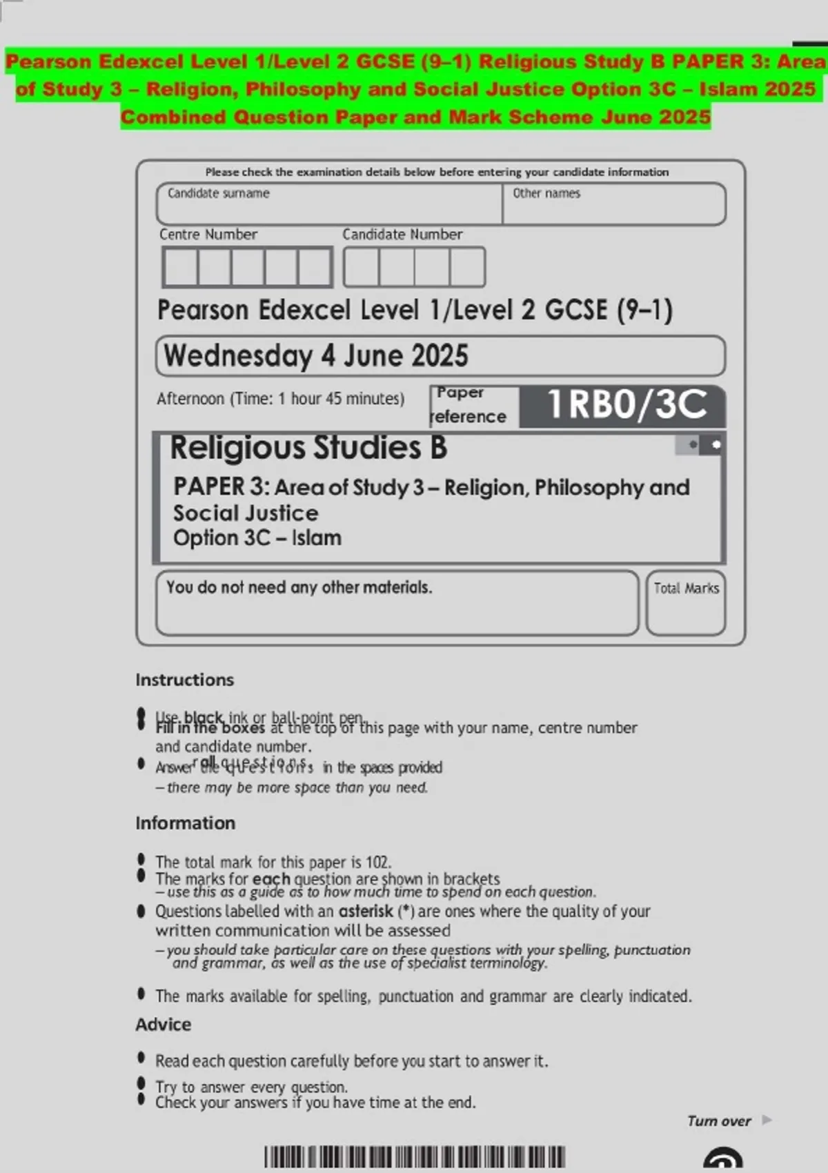 Pearson Edexcel Level 1/Level 2 GCSE (9–1) Religious Study B PAPER 3: Area of Study 3 – Religion, Philosophy and Social Justice Option 3C – Islam 2025 Combined Question Paper and Mark Scheme June 2025
