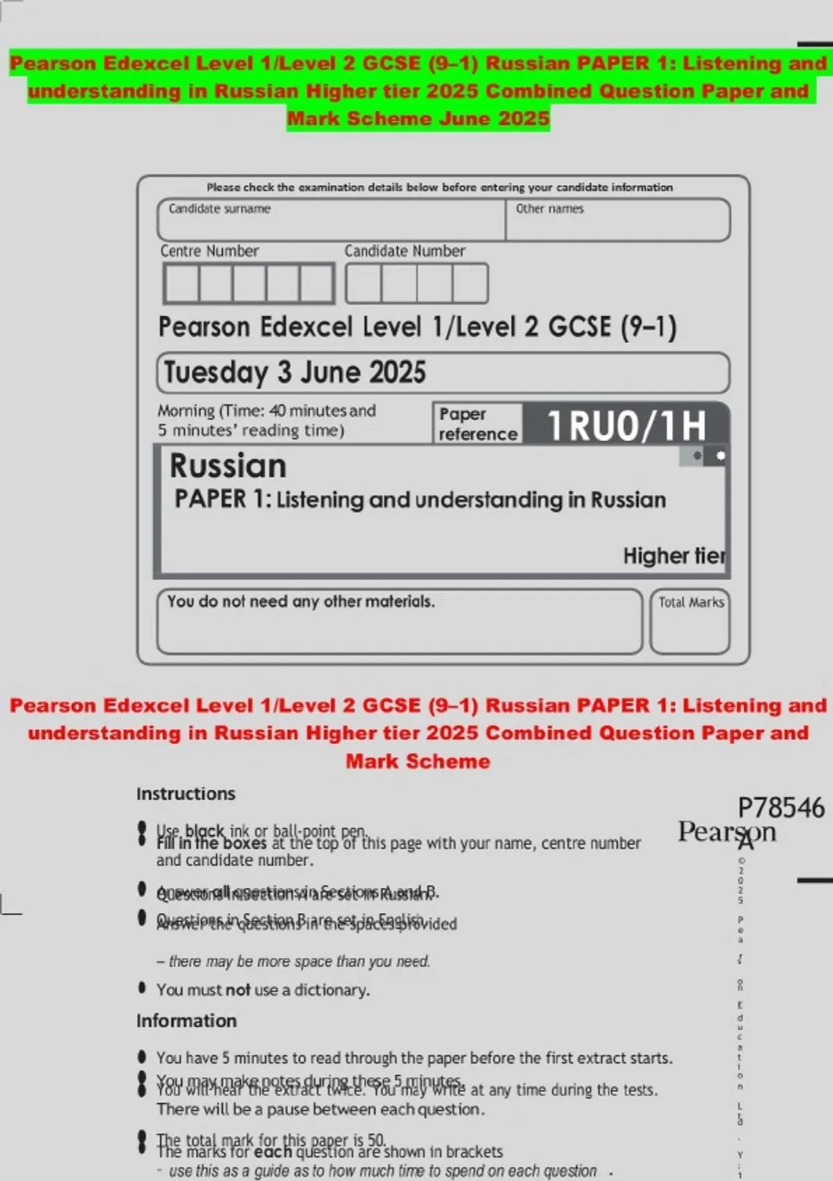 Pearson Edexcel Level 1/Level 2 GCSE (9–1) Russian PAPER 1: Listening and understanding in Russian Higher tier 2025 Combined Question Paper and Mark Scheme June 2025