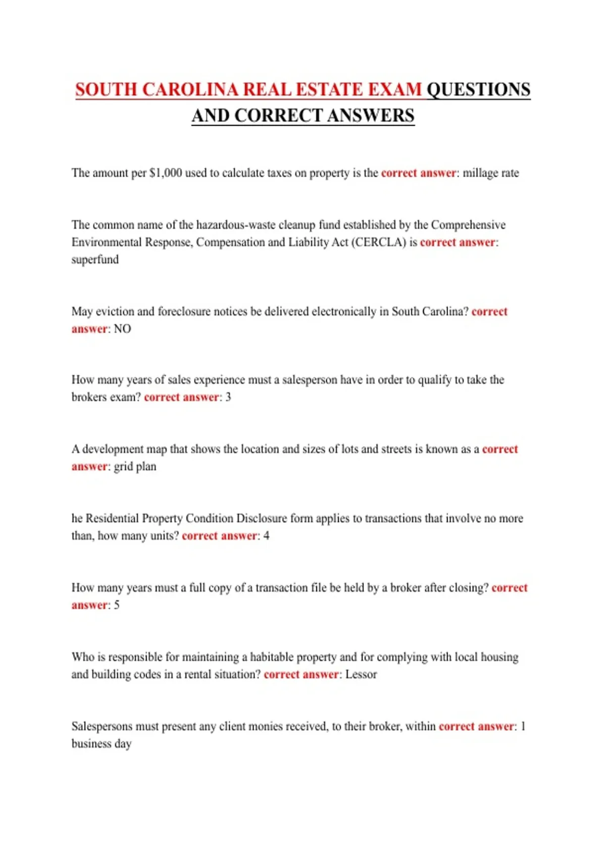 SOUTH CAROLINA REAL ESTATE EXAM QUESTIONS AND CORRECT ANSWERS