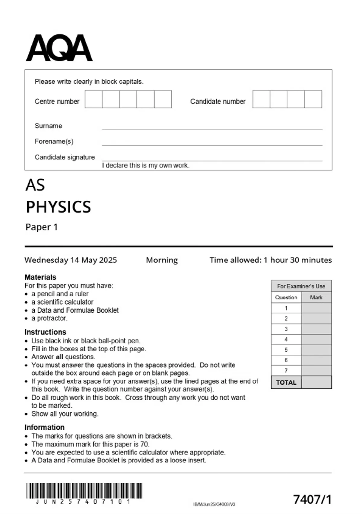AQA 2025 Physics AS 7407/1 Paper 1 MERGED QUESTION PAPER & MARKSCHEME