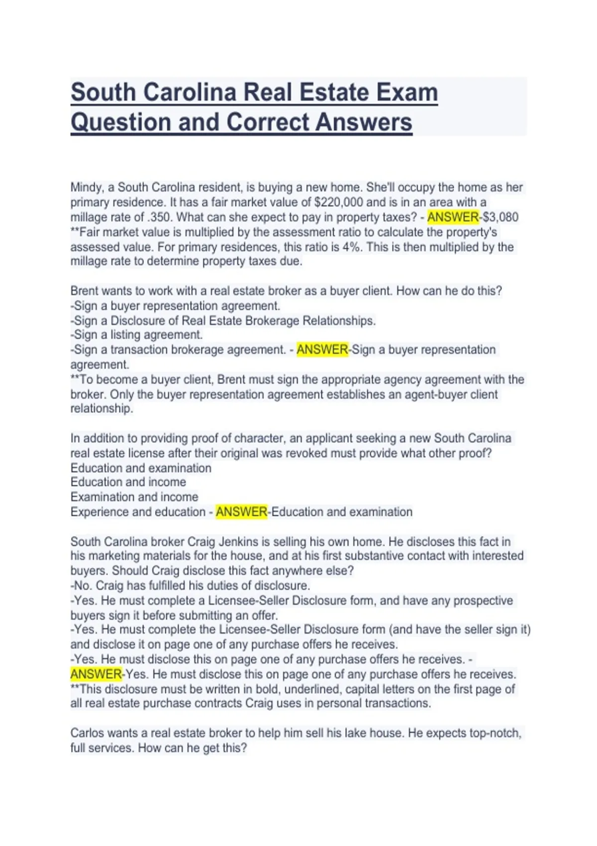 South Carolina Real Estate Exam Question and Correct Answers| Latest Update