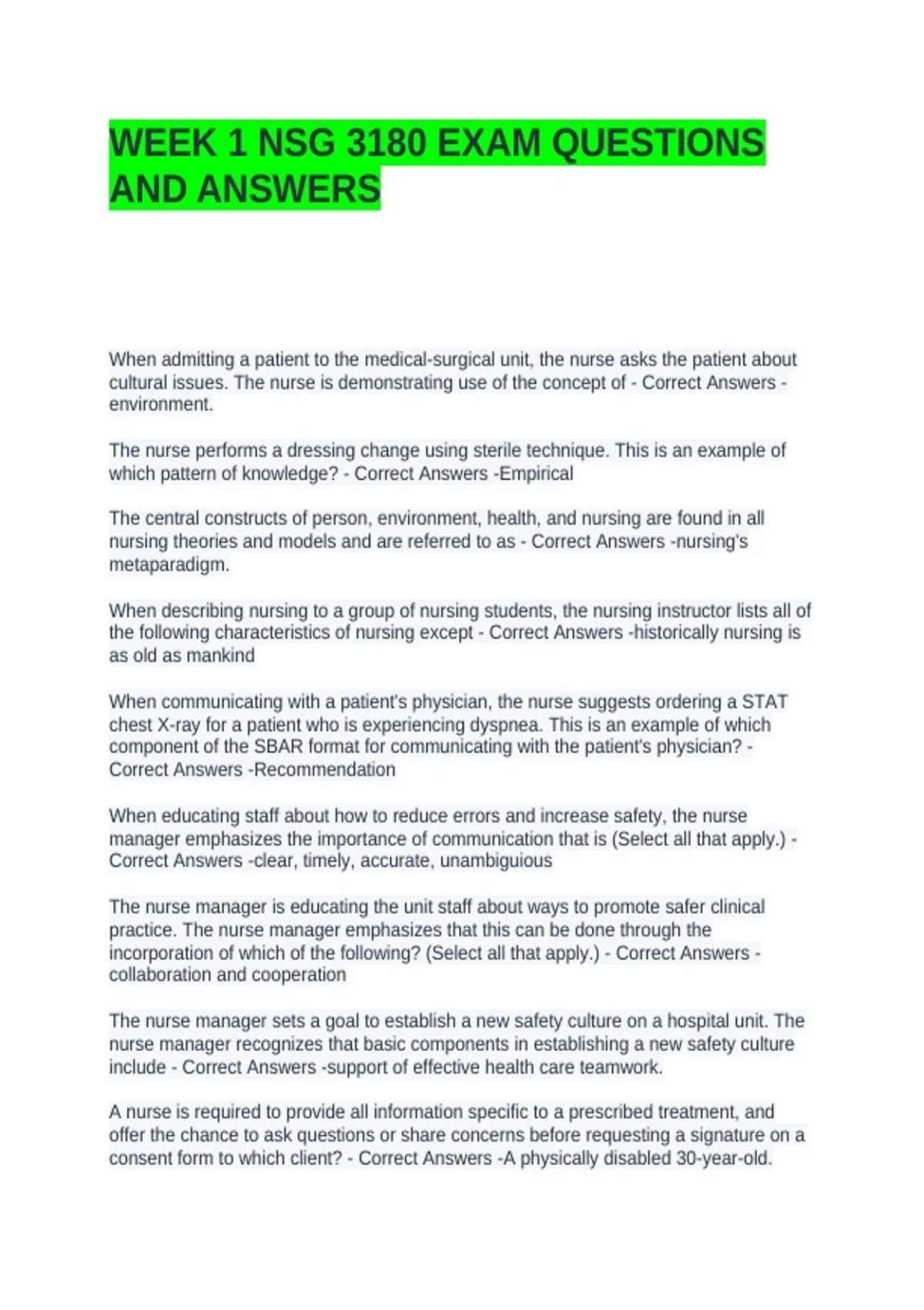 WEEK 1 NSG 3180 EXAM QUESTIONS