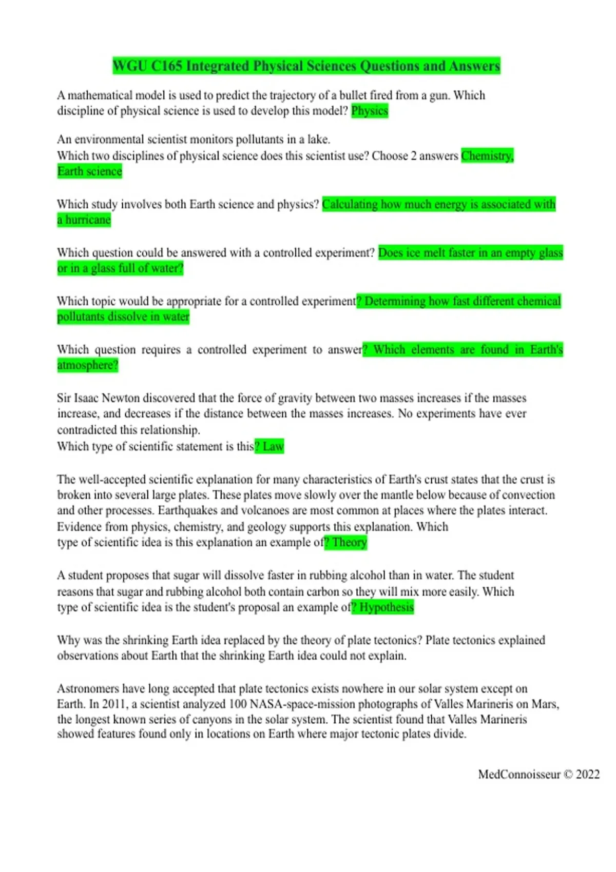 WGU C165 Integrated Physical Sciences – Complete Questions & Answers for Confident Exam Readiness. This questions-and-answers resource for WGU C165 Integrated Physical Sciences is designed to support focused, efficient exam preparation. It covers the full scope of the course, including core concepts from physics, chemistry, earth science, and basic scientific reasoning. The content is structured to reflect assessment-style questions, helping learners reinforce understanding, identify weak areas, and approach the WGU C165 exam with confidence. Ideal for self-paced review, final exam preparation, and mastery of integrated physical science fundamentals.