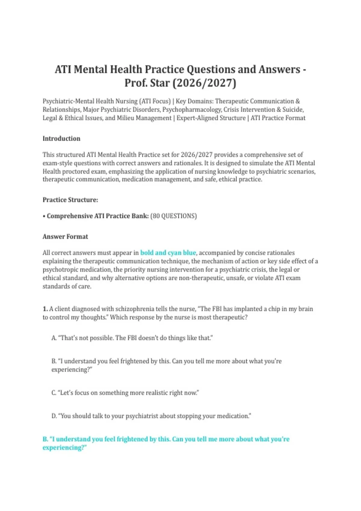 exam-style questions with correct answers and rationales. It is designed to simulate the ATI Mental