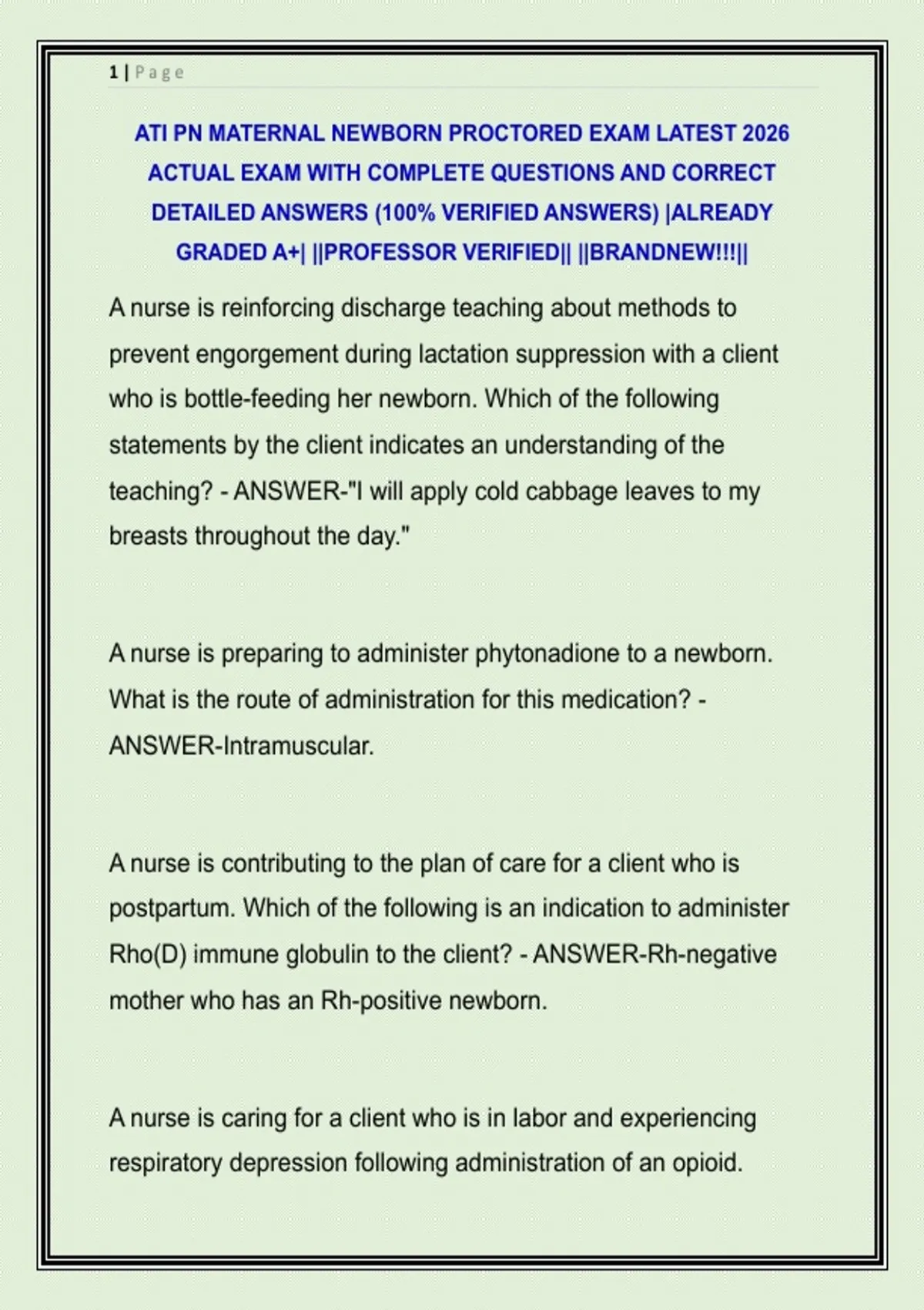 ATI PN MATERNAL NEWBORN PROCTORED EXAM LATEST 2026