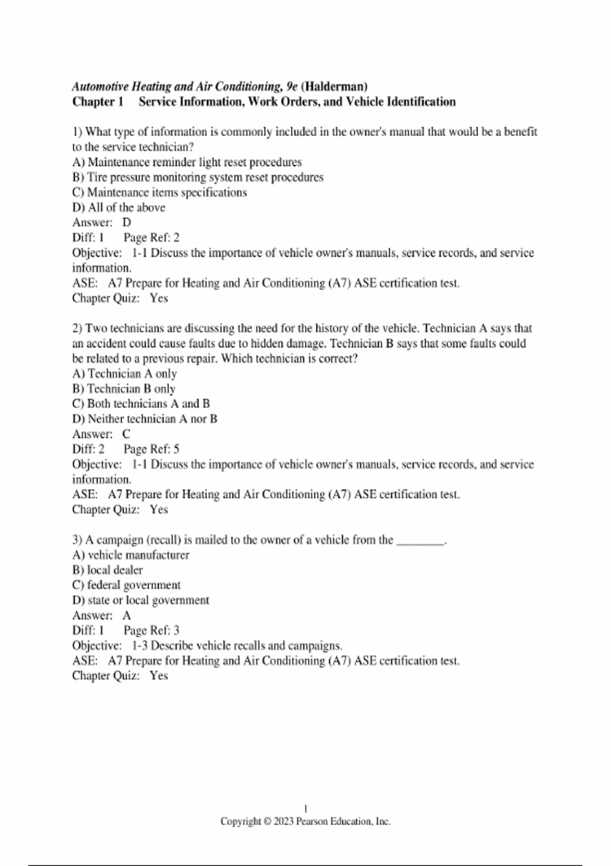 Test Bank For Automotive Heating and Air Conditioning, 9th edition James D. Halderman