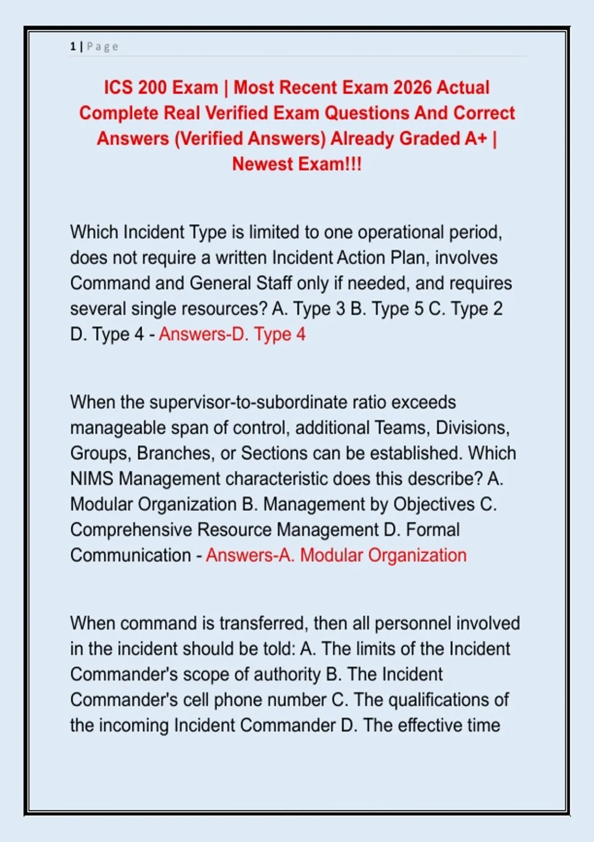 ICS 200 Exam | Most Recent Exam 2026 Actual Complete Real Verified Exam Questions And Correct Answers (Verified Answers) Already Graded A+ | Newest Exam!!!