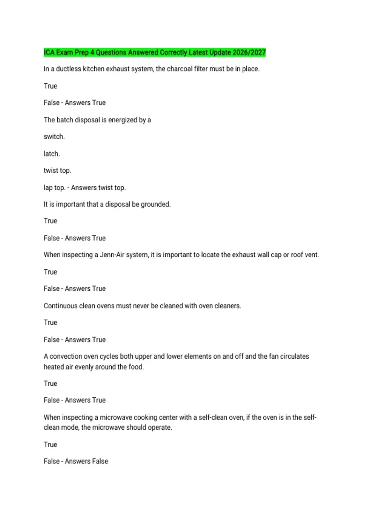 ICA Exam Prep 4 Questions Answered Correctly Latest Update 2026/2027 In a ductless kitchen exhaust system, the charcoal filter must be in place. True False - Answers True The batch disposal is energized by a switch. latch. twist top. lap top. - Answers twist top. It is important that a disposal be grounded. True False - Answers True When inspecting a Jenn-Air system, it is important to locate the exhaust wall cap or roof vent. True False - Answers True Continuous clean ovens must never be cleaned with oven cleaners. True False - Answers True A convection oven cycles both upper and lower elements on and off and the fan circulates heated air evenly around the food. True False - Answers True When inspecting a microwave cooking center with a self-clean oven, if the oven is in the self-clean mode, the microwave should operate. True False - Answers False The proper refrigerator temperature is 34°F to 38°F, and the proper freezer temperature is 0°F. True False - Answers True Clothes dryers may be vented under the house or in the attic. True False - Answers False When inspecting a clothes washer, the inspector must move the washer. True False - Answers False The vent pipe for a ducted kitchen exhaust system is limited as to size and number of elbows. True False - Answers True Self-cleaning ovens clean the interior of the oven using heat. True False - Answers True The Jenn-Air vent filter must be placed in proper position. True False - Answers True When inspecting an electric cooktop, the top should be raised and the wiring inspected for any damage. True False - Answers True Before operating a microwave oven, what items of the microwave oven should you check first? Broken door hinges, seals, and broken glass Damaged case (interior and exterior) Outlet not grounded All of the above - Answers All of the above What should you check when inspecting a central vacuum? Vacuum grounded No water in dust bag Check each outlet for proper operation All of the above - Answers All of the above When inspecting a garage door opener, you should check the automatic reversing feature. True False - Answers True Inspectors should report any damage observed on the garage door. True False - Answers True When inspecting the swimming pool, the inspector must not attempt to leak test a pool on a residential inspection. True False - Answers True If the skimmer liner is cracked, it must be noted as a defeat. True False - Answers True A swimming pool that has been winterized may be inspected. True False - Answers False The pool deck must always slope away from the pool. True False - Answers True When air bubbles are observed flowing through a swimming pool's returns, it indicates