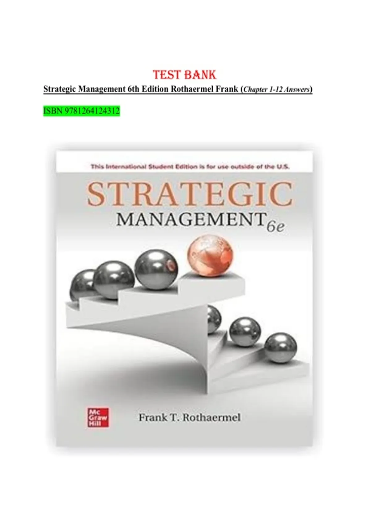 Test Bank for Strategic Management, 6th Edition by Frank Rothaermel – Complete and Updated Coverage. This test bank for Strategic Management, 6th Edition by Frank Rothaermel offers comprehensive chapter-by-chapter questions covering strategic analysis, competitive advantage, corporate strategy, and implementation frameworks. Designed to support exam preparation, self-assessment, and mastery of key concepts, it ensures full coverage of the textbook content while helping students excel in business strategy courses.