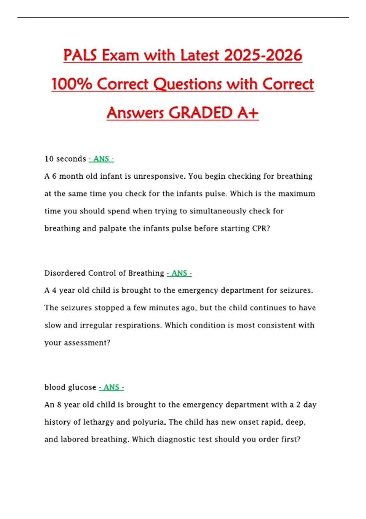 This study guide provides a complete set of the latest 2025–2026 PALS exam questions with verified correct answers. It covers pediatric assessment, airway management, respiratory and cardiac emergencies, shock, arrhythmias, resuscitation protocols, and prioritization of care, ensuring mastery of content and full exam readiness.