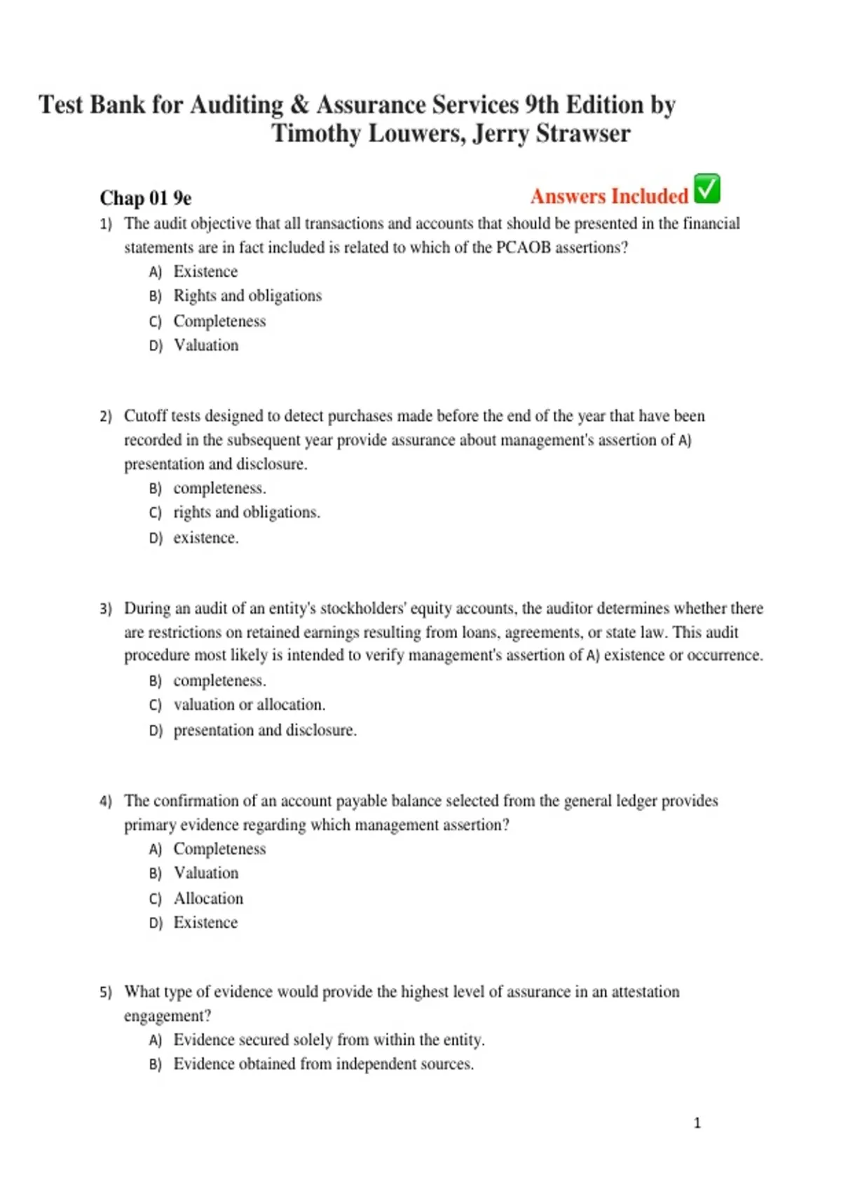 This document contains the complete test bank for Auditing & Assurance Services (9th Edition) by Timothy Louwers and Jerry Strawser, covering all major auditing and assurance topics from the textbook. It includes practice questions designed to support exam preparation, self-study, and course assessments, aligned with the structure and learning objectives of the 9th edition.