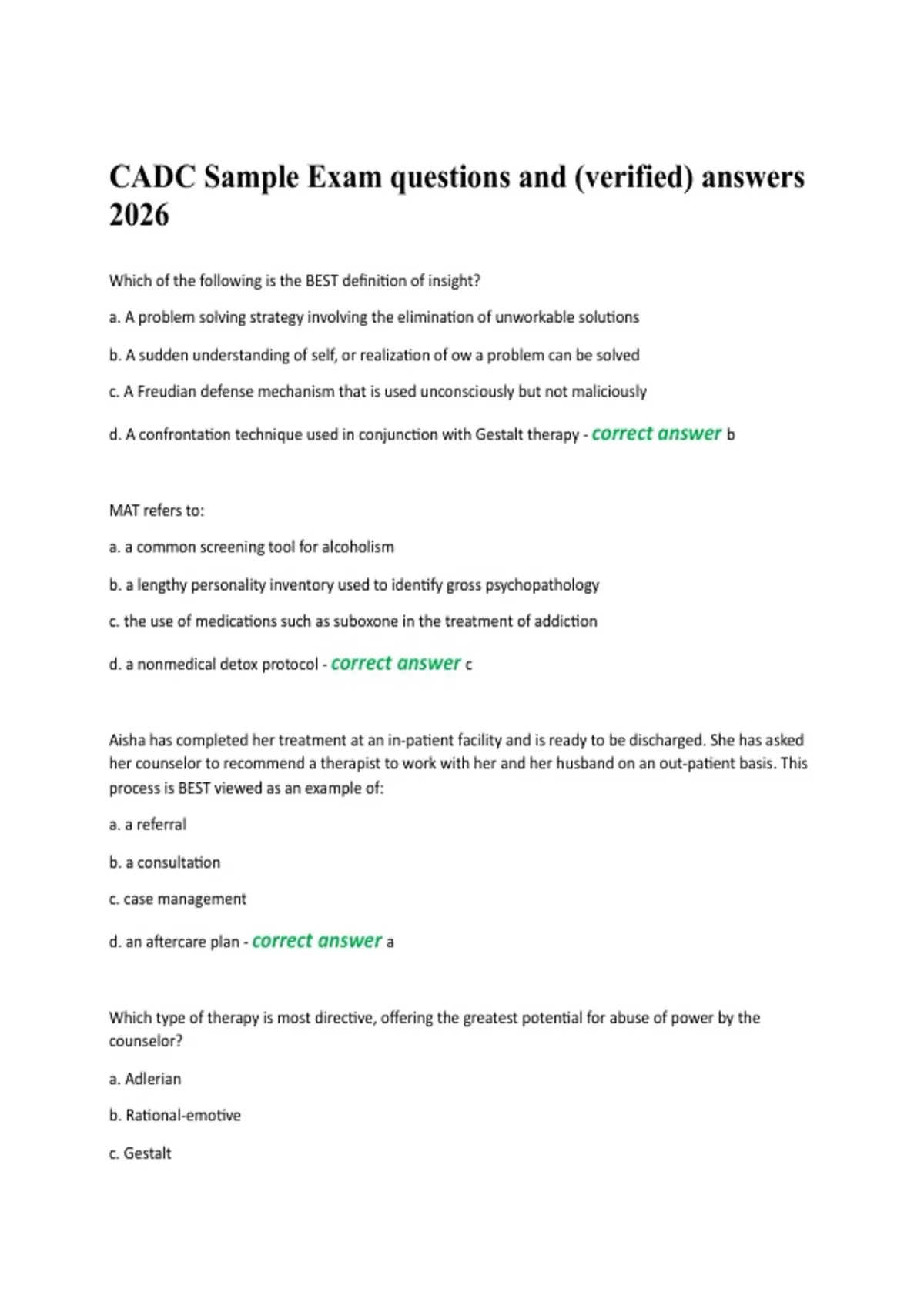 This document provides a set of sample CADC exam questions with verified and accurate answers for the 2026 examination. It covers essential CADC knowledge areas including substance use disorders, counseling approaches, ethics, assessment, treatment planning, and professional practice, making it ideal for exam practice and review.