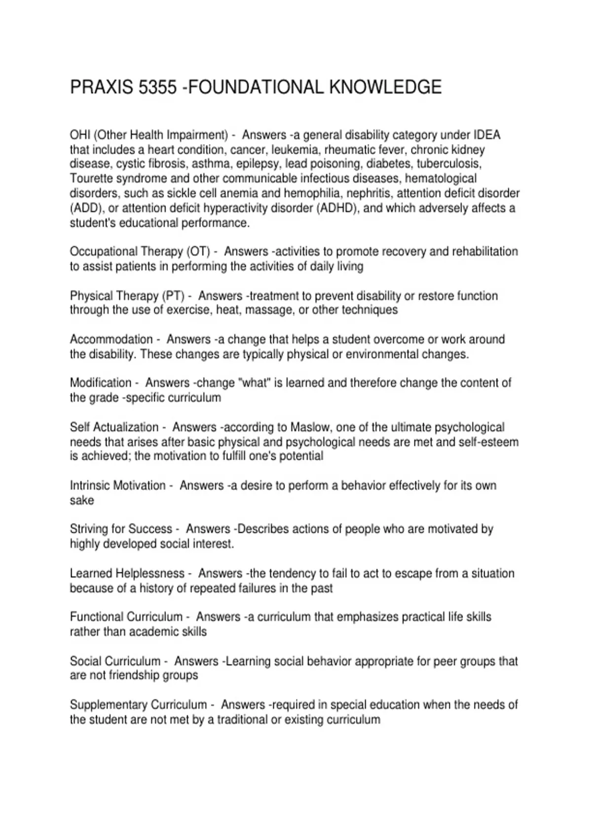 OHI (Other Health Impairment) - Answers -a general disability category under IDEA
