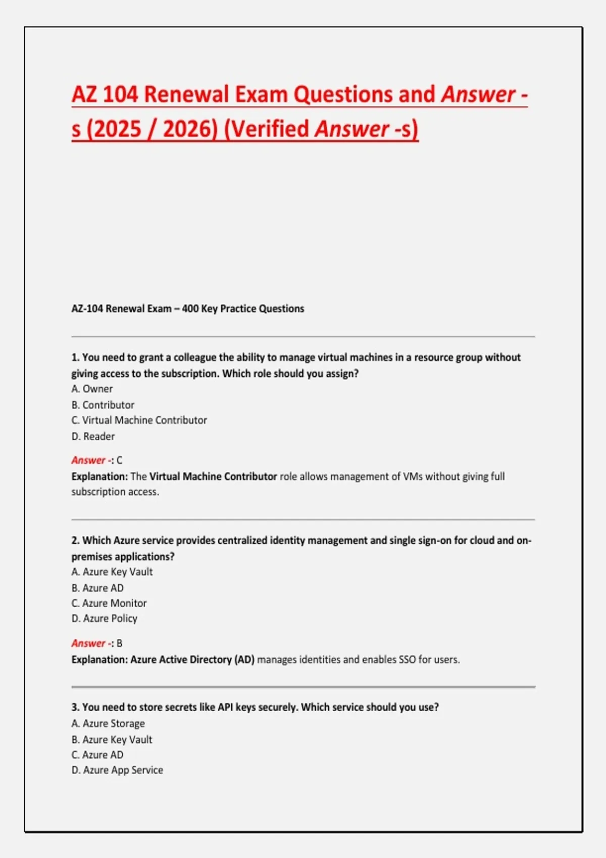 AZ 104 Renewal Exam Questions and Answer -