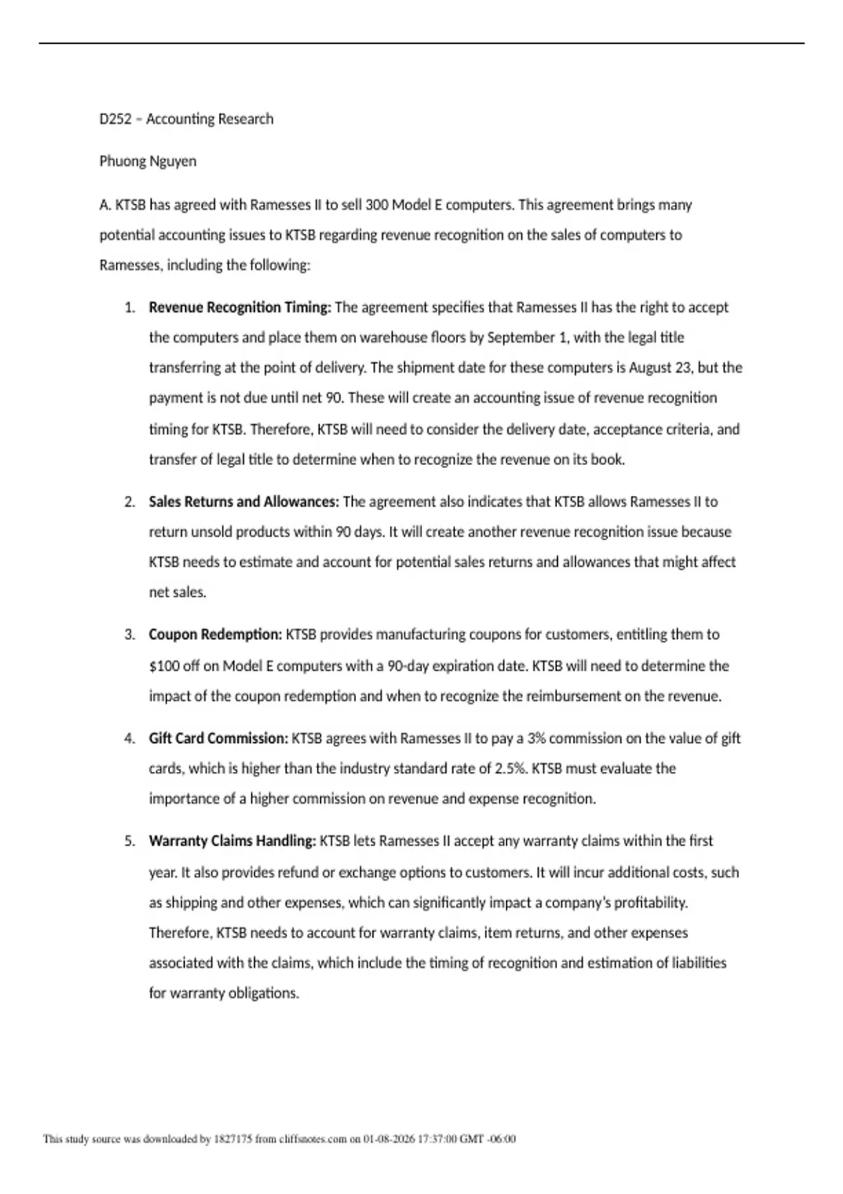 potential accounting issues to KTSB regarding revenue recognition on the sales of computers to