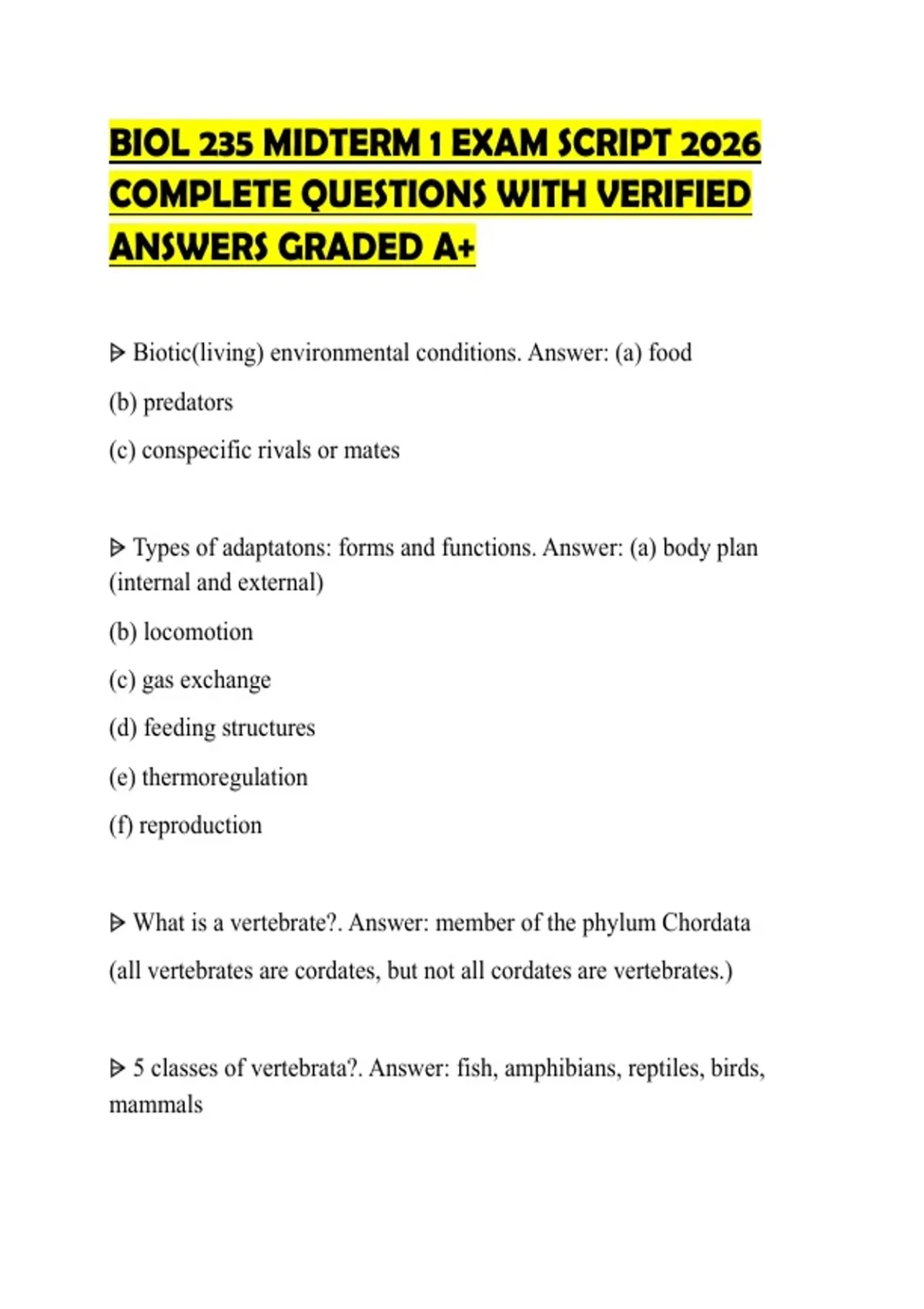 BIOL 235 MIDTERM 1 EXAM SCRIPT 2026 COMPLETE QUESTIONS WITH VERIFIED ANSWERS GRADED A+