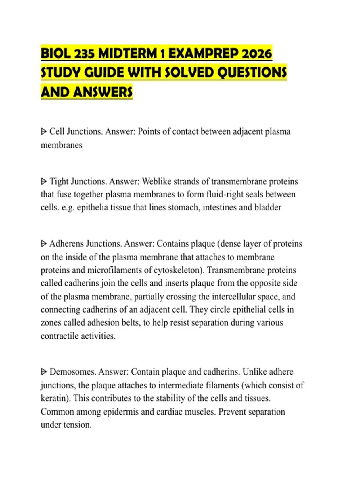 BIOL 235 MIDTERM 1 EXAMPREP 2026 STUDY GUIDE WITH SOLVED QUESTIONS AND ANSWERS