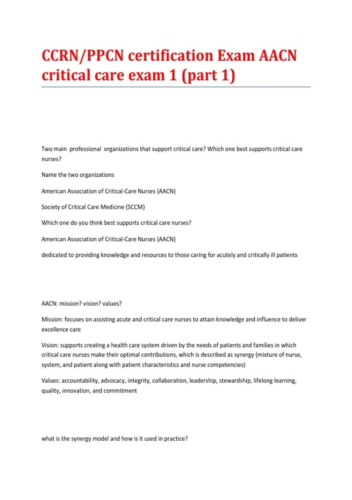 CCRN/PPCN certification Exam AACN critical care exam 1 (part 1)