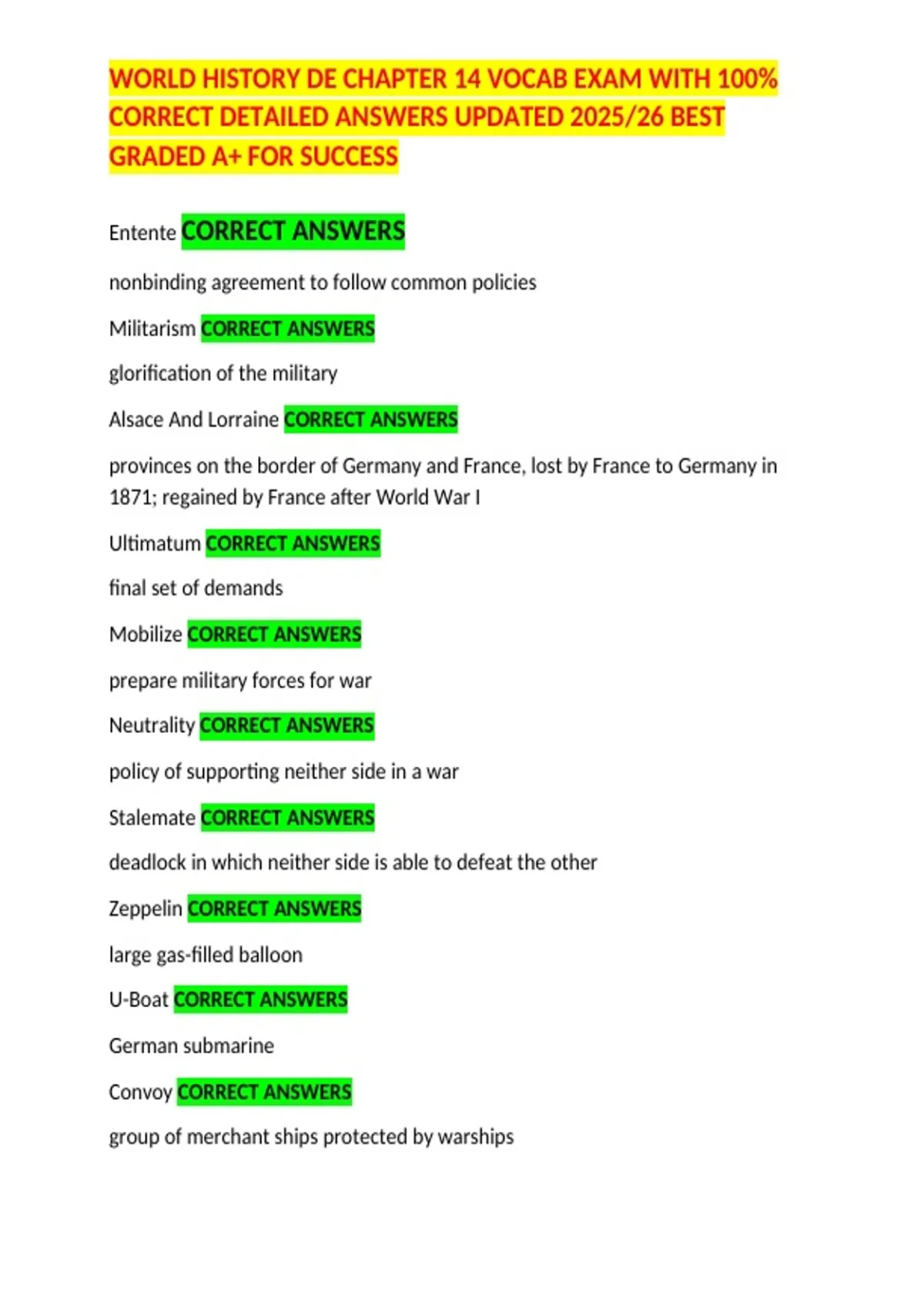 WORLD HISTORY DE CHAPTER 14 VOCAB EXAM WITH 100% CORRECT DETAILED ANSWERS UPDATED 2025/26 BEST GRADED A+ FOR SUCCESS