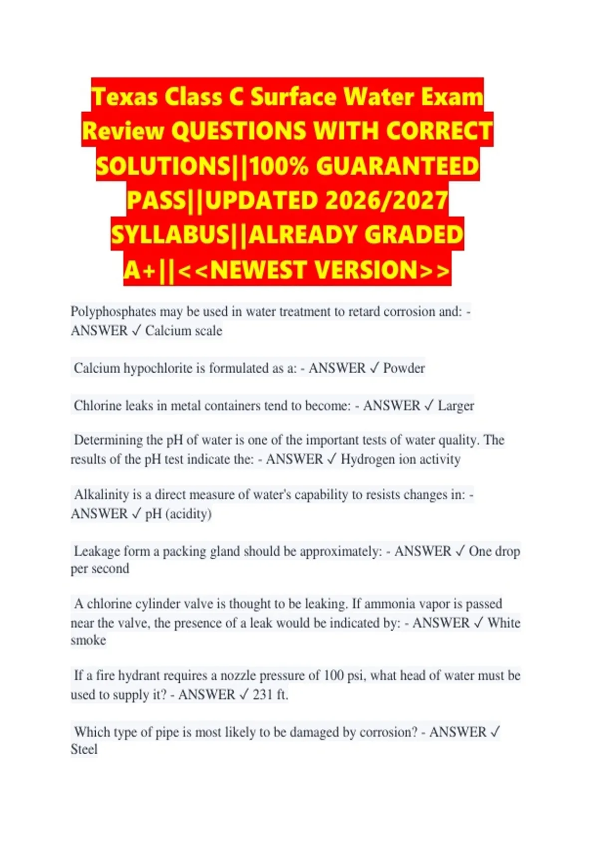 Calcium hypochlorite is formulated as a: - ANSWER ✓ Powder