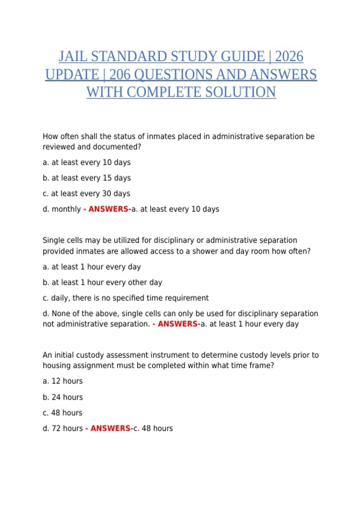 This document provides a comprehensive review of jail standards for 2026, featuring 206 exam-style questions with fully verified, step-by-step solutions. It is designed to help trainees, corrections officers, and law enforcement students prepare effectively, reinforce essential knowledge, and confidently pass their exams. All questions are carefully solved and reviewed, ensuring alignment with current jail standards, policies, and training objectives. The material is ideal for self-study, focused revision, and practical exam preparation.