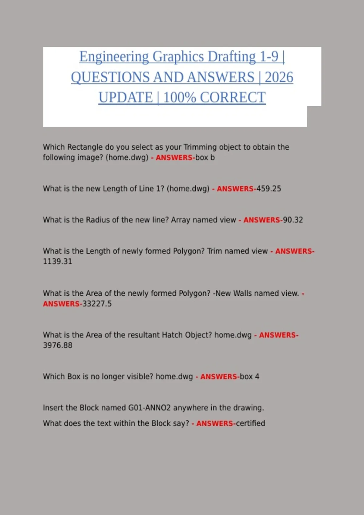 This document provides a comprehensive review of Engineering Graphics Drafting 1–9 for 2026, featuring exam-style questions with fully verified, step-by-step solutions. It is designed to help students master drafting concepts, reinforce practical skills, and achieve top grades. All questions have been carefully solved and reviewed, ensuring alignment with current engineering graphics standards, drafting principles, and typical exam formats. The material is ideal for self-study, focused revision, and exam preparation.