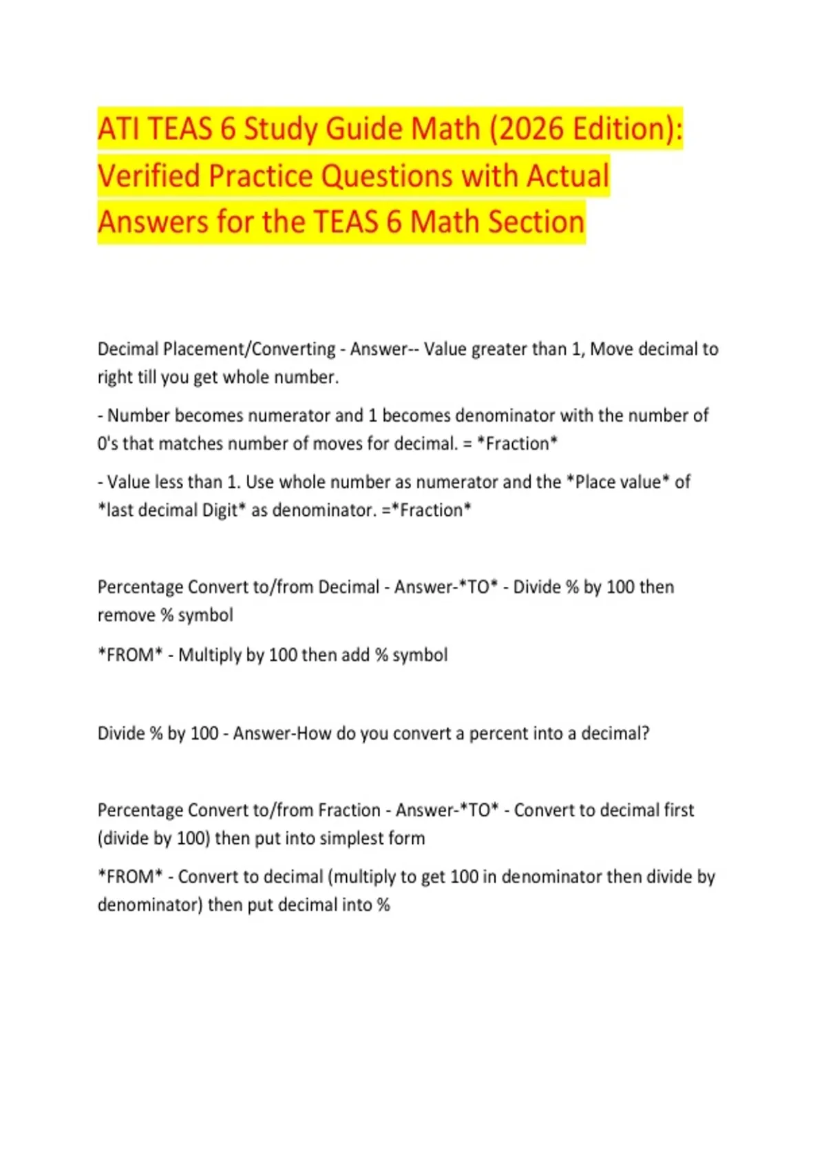 Decimal Placement/Converting - Answer-- Value greater than 1, Move decimal to right till you get whole number. - Number becomes numerator and 1 becomes denominator with the number of 0's that matches number of moves for decimal. = *Fraction* - Value less than 1. Use whole number as numerator and the *Place value* of *last decimal Digit* as denominator. =*Fraction* Percentage Convert to/from Decimal - Answer-*TO* - Divide % by 100 then remove % symbol *FROM* - Multiply by 100 then add % symbol