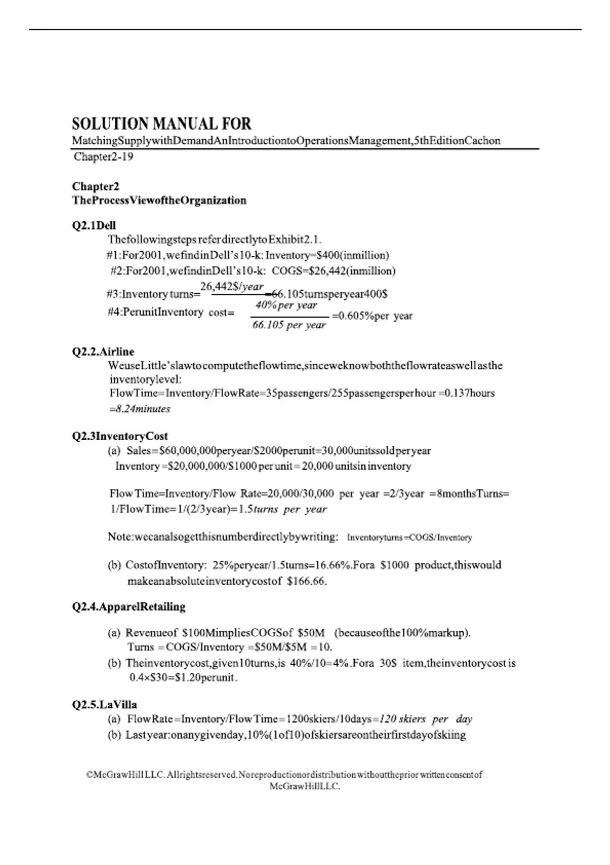 Solution Manual for Matching Supply with Demand An Introduction to Operations Management, 5th Edition Cachon. Table of Contents: Chapter 2:The Process View of the Organization Chapter 3:Understanding the Supply Process: Evaluating Process Capacity Chapter 4:Estimating and Reducing Labor Costs Chapter 5:Batching and Other Flow Interruptions: Setup Times and the Economic Order Quantity Model Chapter 6:The Link between Operations and Finance Chapter 7:Quality and Statistical Process Control Chapter 8:Lean Operations and the Toyota Production System Chapter 9:Variability and Its Impact on Process Performance: Waiting Time Problems Chapter 10:The Impact of Variability on Process Performance: Throughput Losses Chapter 11:Scheduling to Prioritize Demand Chapter 12:Project Management Chapter 13:Forecasting Chapter 14:Betting on Uncertain Demand: The Newsvendor Model Chapter 15:Assemble-to-Order, Make-to-Order, and Quick Response with Reactive Capacity Chapter 16: Service Levels and Lead Times in Supply Chains: The Order-up-to Inventory Model Chapter 17:Risk-Pooling Strategies to Reduce and Hedge Uncertainty Chapter 18:Revenue Management with Capacity Controls Chapter 19:Supply Chain Coordination