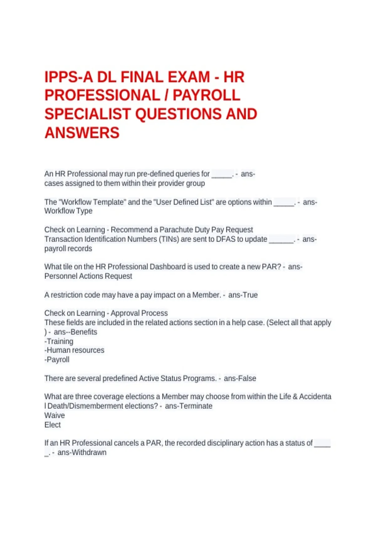 IPPS-A DL FINAL EXAM - HR PROFESSIONAL / PAYROLL SPECIALIST QUESTIONS AND ANSWERS