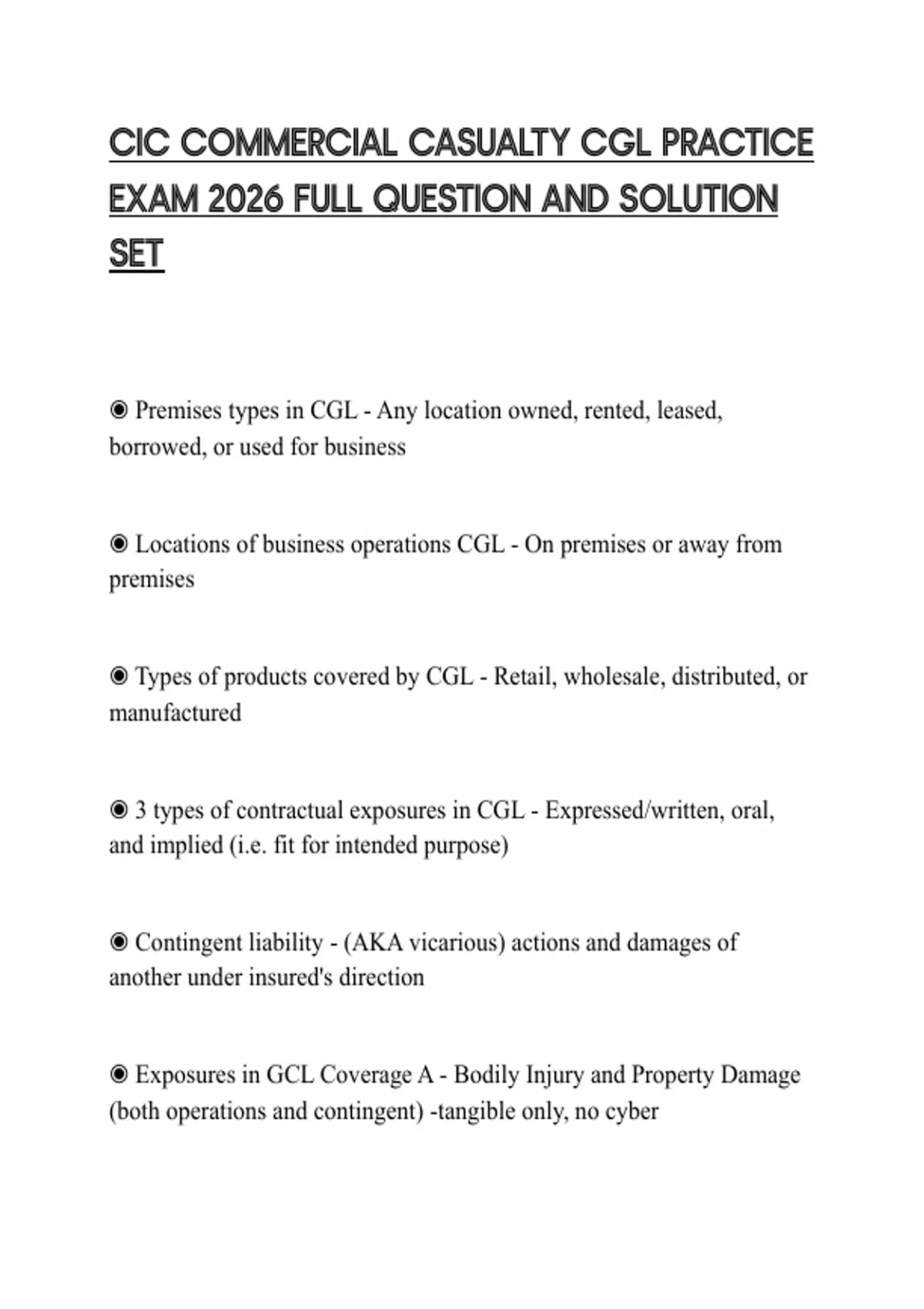 CIC COMMERCIAL CASUALTY CGL PRACTICE EXAM 2026 FULL QUESTION AND SOLUTION SET