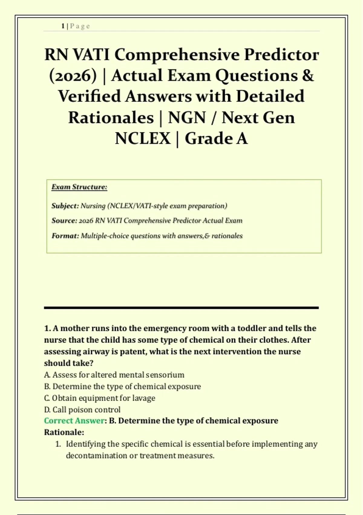 This RN VATI Comprehensive Predictor Exam 2026 resource provides exam-aligned practice questions designed to reflect the latest VATI and Next Gen NCLEX (NGN) standards. It includes actual-style exam questions with verified answers and detailed rationales to support accurate understanding and effective exam preparation. This material is intended for RN students in ADN and BSN nursing programs who are completing the VATI Comprehensive Predictor as part of their NCLEX readiness process. The content addresses clinical judgment, prioritization, delegation, and integrated nursing concepts commonly assessed on the predictor exam. By practicing with realistic NGN-style questions and clear rationales, students can strengthen critical thinking, identify knowledge gaps, and build confidence for both the VATI Comprehensive Predictor and the Next Gen NCLEX.