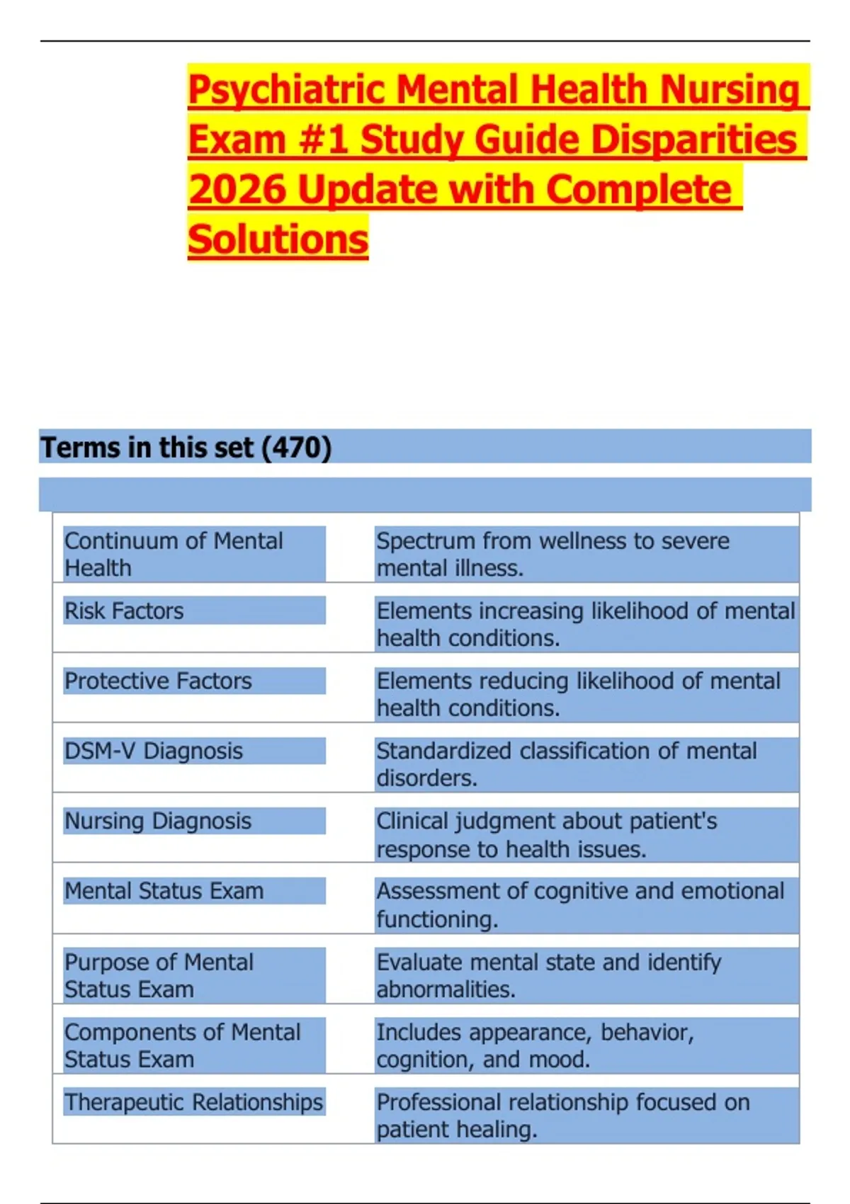 Psychiatric Mental Health Nursing Exam #1 Study Guide Disparities 2026 Update with Complete Solutions