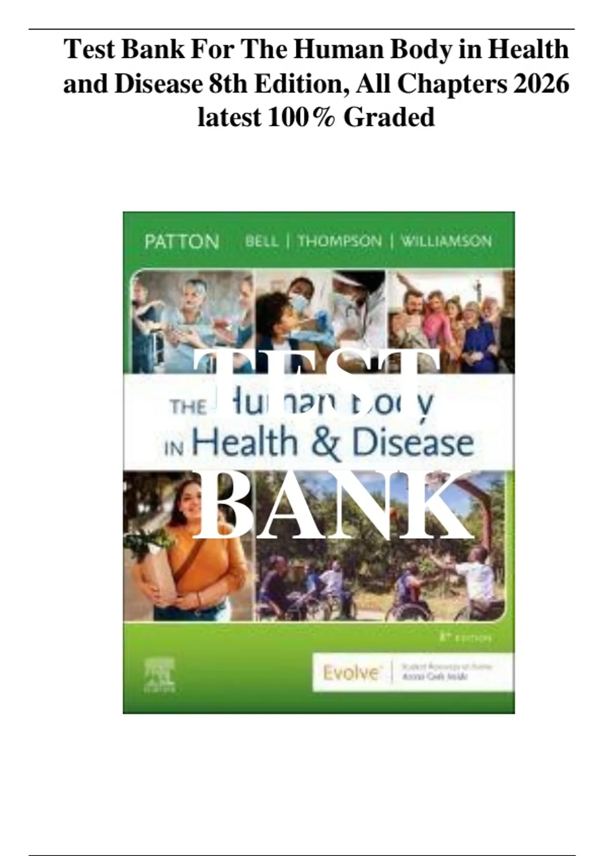 The Human Body in Health and Disease 8th Edition by Kevin T. Patton, PhD and Gary A. Thibodeau, PhD. This test bank provides chapter-by-chapter questions and answers designed to reinforce foundational knowledge of human anatomy, physiology, disease mechanisms, and clinical applications relevant to nursing, allied health, and health science education. Content aligns with the textbook’s structure and supports mastery of body systems, homeostasis, pathology, and functional integration of health and disease concepts. ISBN: 9780323734141 1 Introduction to the Body 2 Chemistry of Life 3 Cells 4 Tissues 5 Organ Systems 6 Mechanisms of Disease 7 Skin and Membranes 8 Skeletal System 9 Muscular System 10 Nervous System 11 Senses 12 Endocrine System 13 Blood 14 Heart 15 Circulation of Blood 16 Lymphatic System & Immunity 17 Respiratory System 18 Digestive System 19 Nutrition & Metabolism 20 Urinary System 21 Fluid & Electrolyte Balance 22 Acid-Base Balance 23 Reproductive Systems 24 Growth, Development, & Aging 25 Genetics & Genetic Diseases