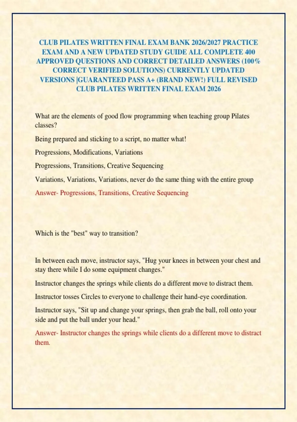 CLUB PILATES WRITTEN FINAL EXAM BANK 2026/2027 PRACTICE EXAM AND A NEW UPDATED STUDY GUIDE ALL COMPLETE 400 APPROVED QUESTIONS AND CORRECT DETAILED ANSWERS (100% CORRECT VERIFIED SOLUTIONS) CURRENTLY UPDATED VERSIONS |GUARANTEED PASS A+ (BRAND NEW!) FULL REVISED CLUB PILATES WRITTEN FINAL EXAM 2026