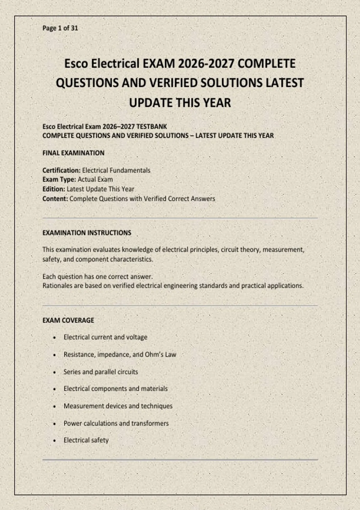 Tap on AVAILABLE IN BUNDLE / PACKAGE DEAL to unlock free bonus exams — save more while getting everything you need! You’ll be glad you did! The Esco Electrical Exam 2026–2027 – Complete Questions and Verified Solutions (Latest Update This Year) delivers a fully updated and comprehensive collection of verified questions designed to help candidates confidently prepare for the Esco Electrical certification exam. This in-depth study resource covers essential topics including electrical theory, circuits and wiring, safety protocols, troubleshooting, electrical codes and standards, installation practices, maintenance procedures, and regulatory compliance. Each question includes verified solutions to reinforce understanding, strengthen technical reasoning, and enhance exam readiness. Ideal for electricians, electrical technicians, engineers, and individuals pursuing Esco Electrical certification, this exam prep guide ensures thorough preparation and confident performance on the Esco Electrical Exam 2026–2027.